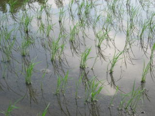 6月20日(播種後48日) 右写真の左側:移植田、右側:直播田