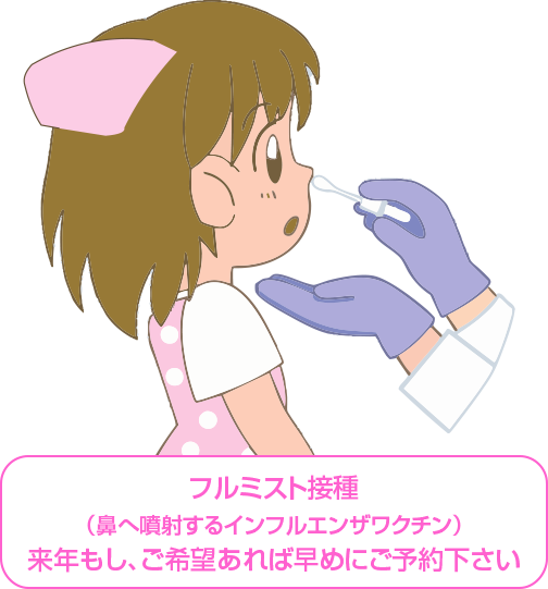 今年からフルミストという鼻へ噴射するワクチンを始めました。