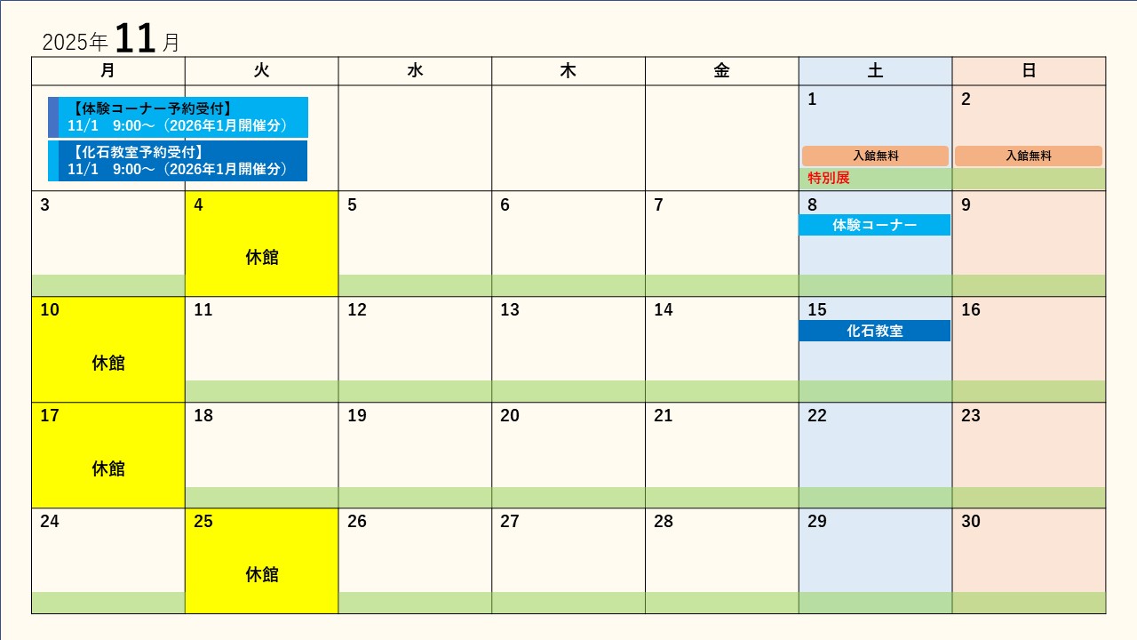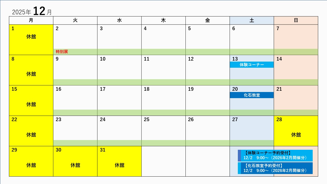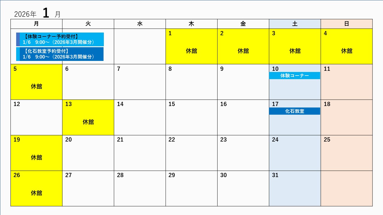 - 1日~:体験コーナー(化石館)予約受付開始(2026年1月開催分:先着2組8名)
