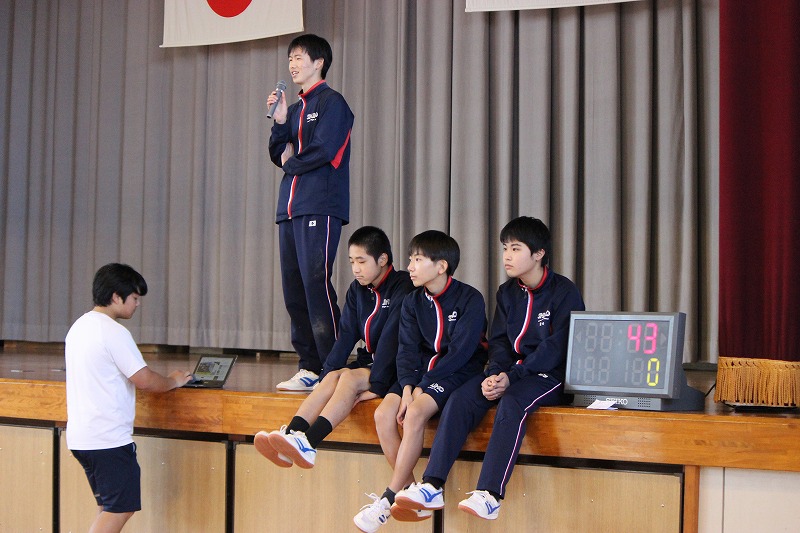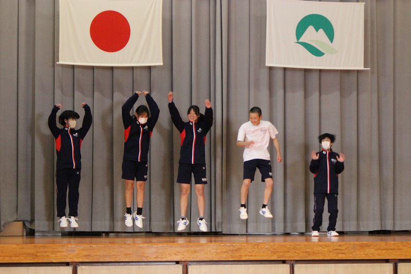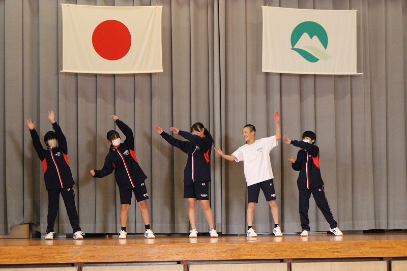 5月の全校集会が行われました。各専門委員会の報告と保健委員会による特別企画がありました。ストレスの対処法について弛緩法を用いたストレッチなどを皆で行い、1ヶ月の疲れを癒やしました。1年生も中学校生活にだいぶ慣れ、全学年ともよく頑張った一ヶ月でしたので、GWはしっかり休養してまた元気に登校してほしいです。 最後に、「統合10周年記念事業実行委員会」のメンバーの紹介がありました。公民館や各機関とのコラボもあり、いろいろなことに挑戦する1年になりそうです!