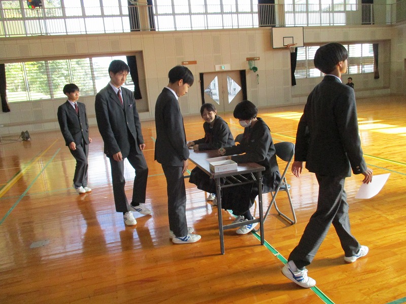 5月8日(木)、大規模な自然災害や事件、事故が発生したという想定のもと、学校が保護者へ生徒を引き渡すという訓練を実施しました。最初に体育館で講義を受けた後、「土砂災害警戒情報」が発令し、裏山が崩れそうということで、秋芳地域まちづくりセンターへ避難し、保護者の方へ迎えに来ていただきました。大変スムーズに実施できたと思います。ご協力ありがとうございました。
