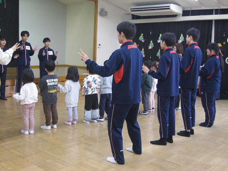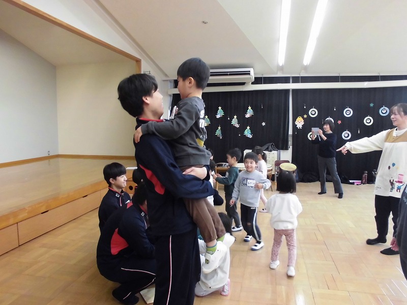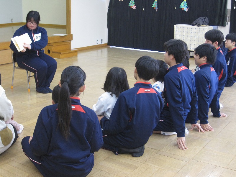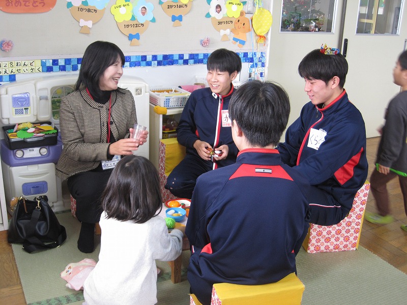 3年生の家庭科の学習では、幼児との関わり方を学んでいます。その一環で、2度に分けて3年生が保育実習を行います。今回(12月9日)は秋芳桂花保育園でした。かわいらしい園児の笑顔に引き込まれるように、3年生もにこやかに園児とふれあっていました。絵本を読んであげたり、子ども達のおもちゃで一緒に遊んだり、外遊びをしたり、あっという間の時間でした。秋吉保育での実習は12月12日(金)を予定しています。
