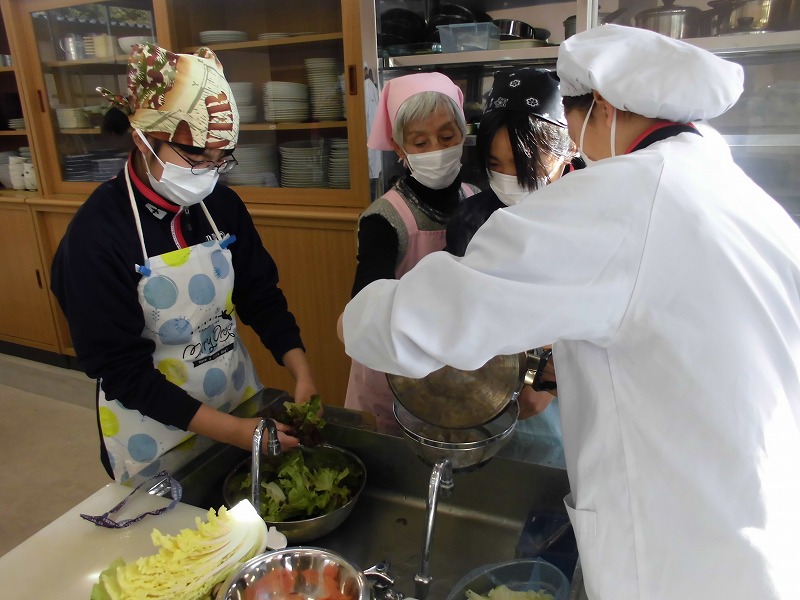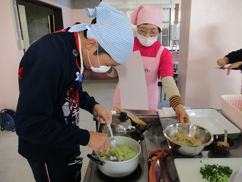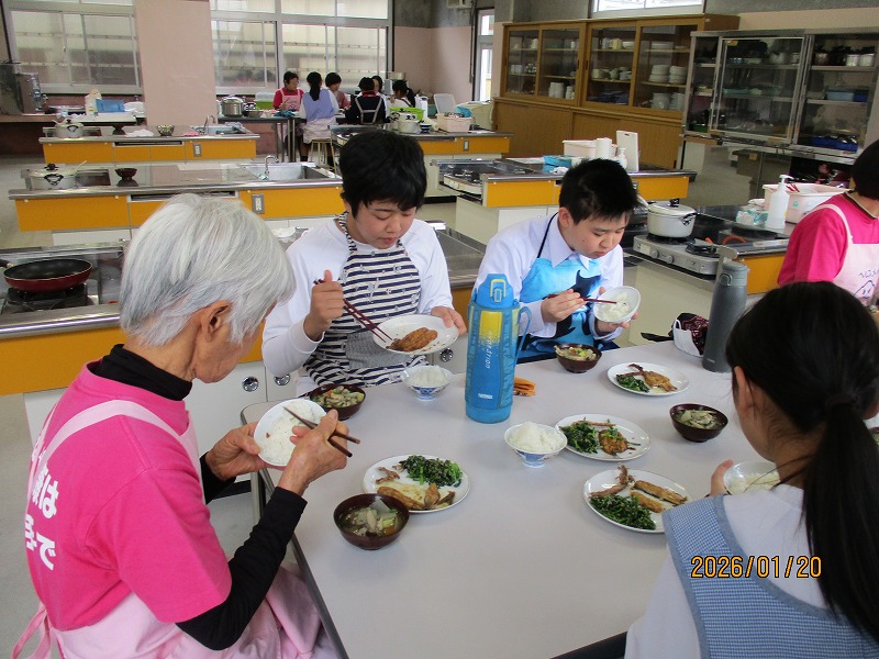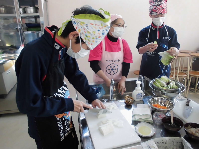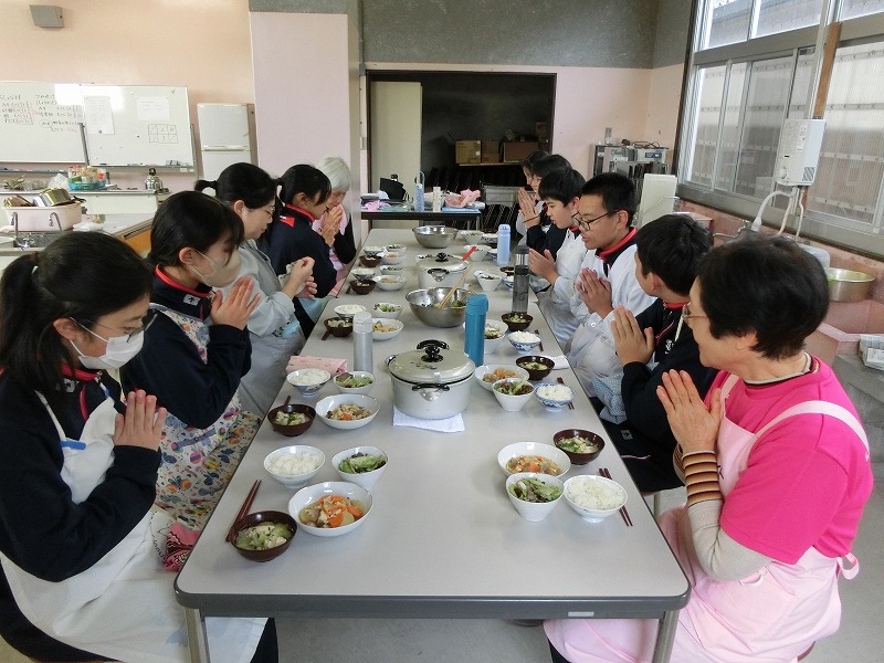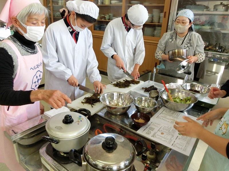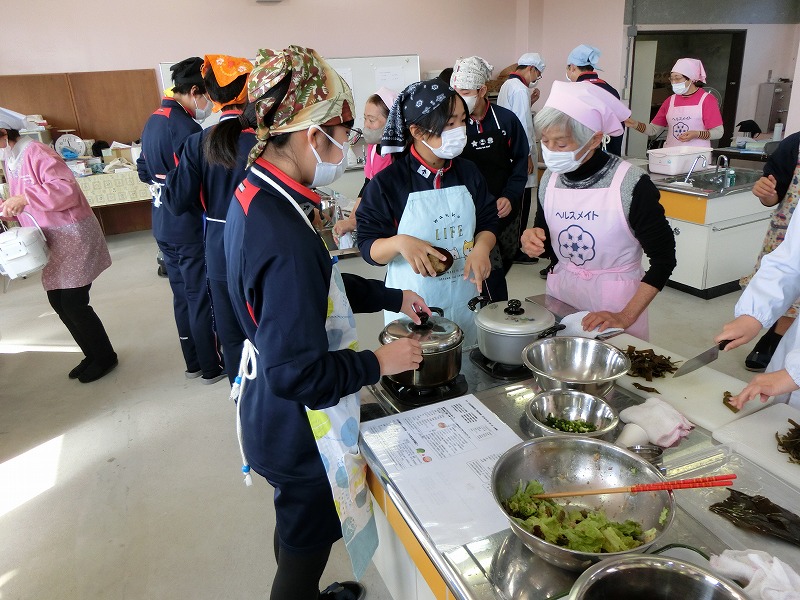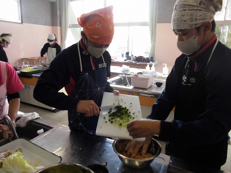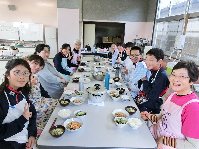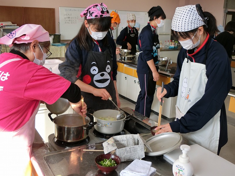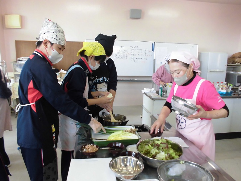 12月16日(火)、2年生の家庭科で調理実習をしました。メニューは郷土料理でけんちょうとチシャなますとつみれ汁でした。今回は、地域の食生活改善推進委員(食推さん)の方がご指導に来てくださり、調理の仕方や地域に伝わる食の知恵を直接伺うことができ、非常に有意義な時間となりました。食のプロである皆様との交流を通じて、食への関心がより一層深まったようです。ご指導ありがとうございました。