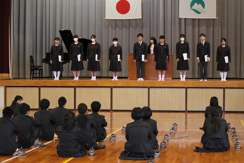 12月24日(水)は2学期の最終日でした。多くの行事が行われた今学期でしたが、一生懸命に取り組んだ生徒達の表情は、達成感に満ちて、また一回り成長したように感じました。人権標語やポスター、交通安全のポスター、さらに美祢市駅伝大会の表彰式も行われました。 生徒会執行部の退任式や任命式も行われ、いよいよ秋芳中も代替わりし、これまでの伝統を引き継ぎつつ、新しい風が吹くのだと期待感でいっぱいになりました。