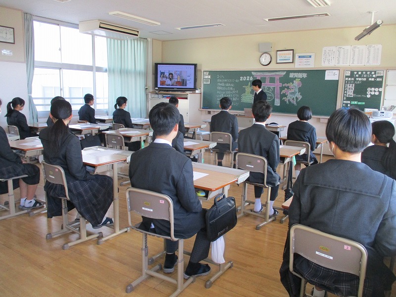 本日、令和8年1月8日(木)は寒気の影響で、気温が非常に低いため、オンラインによる第3学期の始業式を各教室で実施しました。式辞では、午年にちなんで、目標に向かって颯爽と駆け抜け「飛躍」「前進」の年にしていきましょう、また、急激な技術革新が進む現代社会ではありますが、「心の力」を大切にしていきましょうなどと述べました。校歌斉唱では、CDが不調で音が途中で途切れたのですが、生徒たちはアカペラで元気よく歌ってくれました。