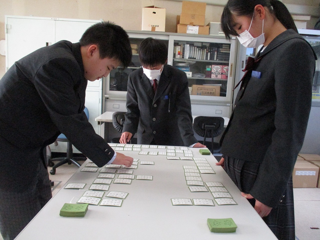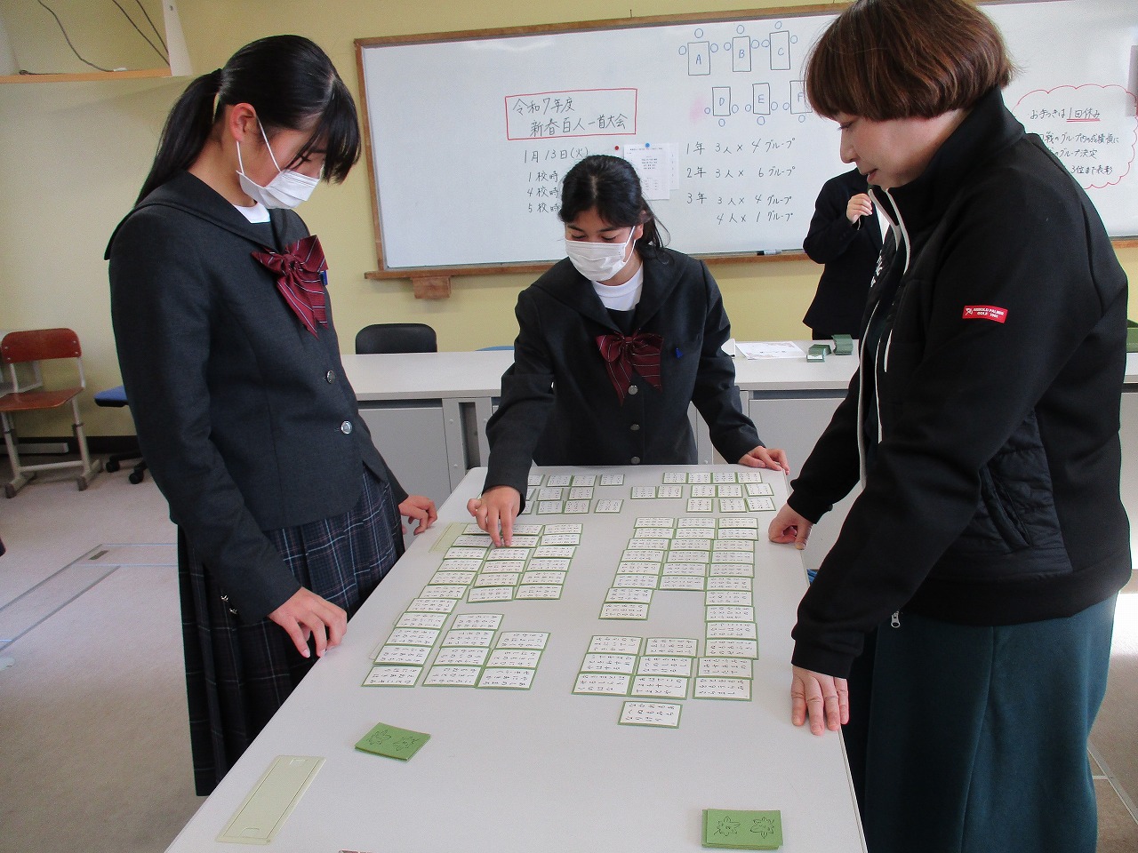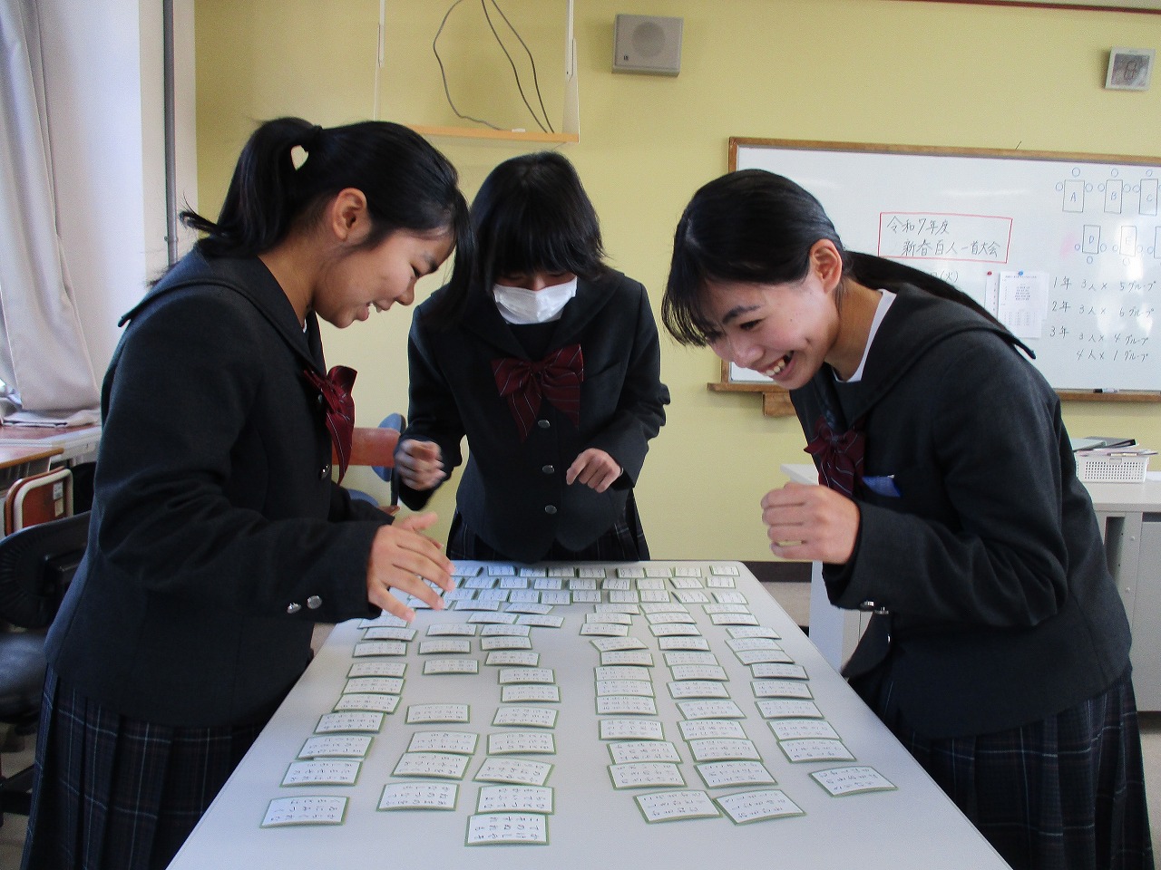 新年最初の行事として、国語科の授業にて、学年別百人一首大会が開催されました。グループで対決した後、成績に応じて次のステージへと進む仕組みになっており、ステージが上がるにつれて、白熱した試合へと展開していきました。日本の伝統文化である百人一首の体験を通じて、楽しみながら級友との親睦を深める貴重な機会となりました。