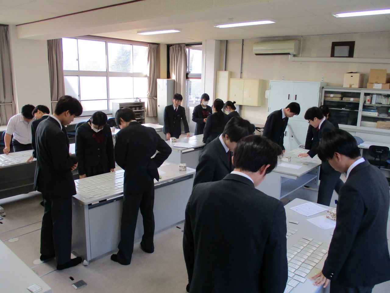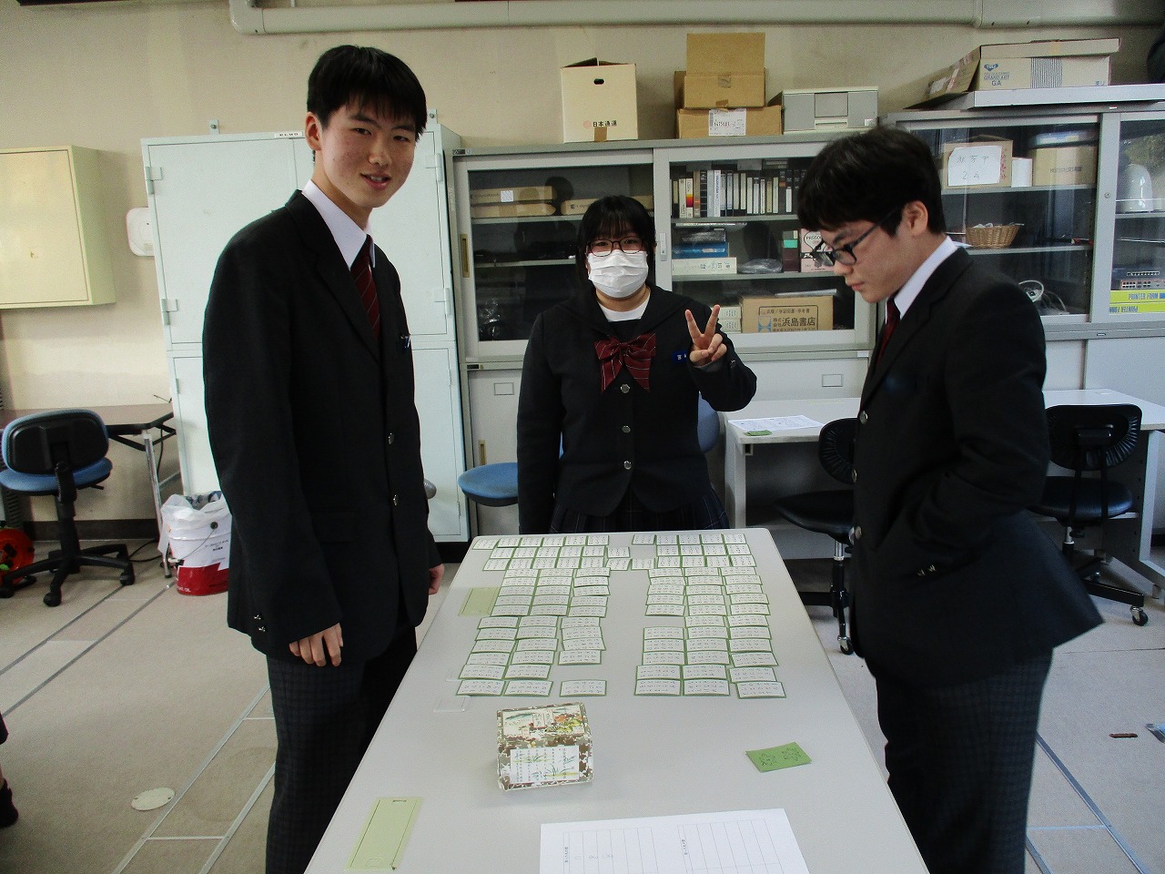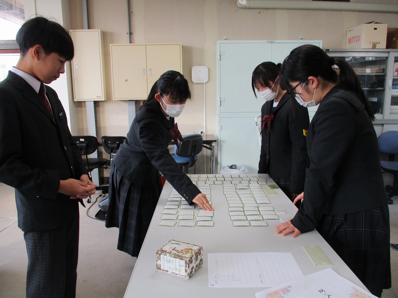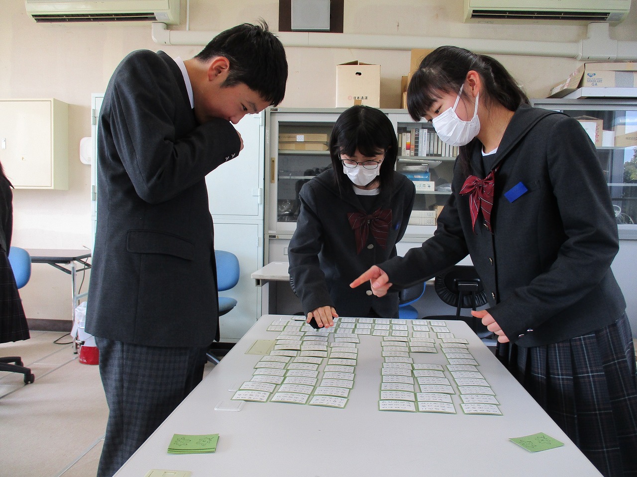 新年最初の行事として、国語科の授業にて、学年別百人一首大会が開催されました。グループで対決した後、成績に応じて次のステージへと進む仕組みになっており、ステージが上がるにつれて、白熱した試合へと展開していきました。日本の伝統文化である百人一首の体験を通じて、楽しみながら級友との親睦を深める貴重な機会となりました。
