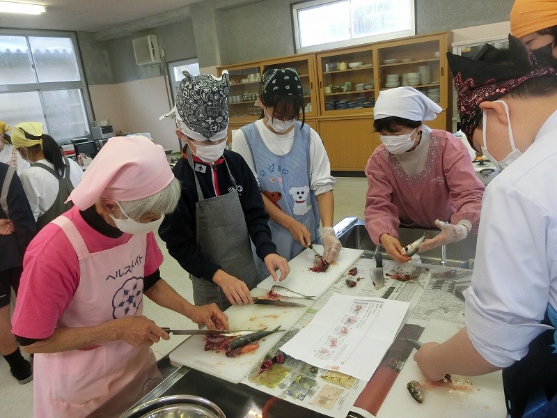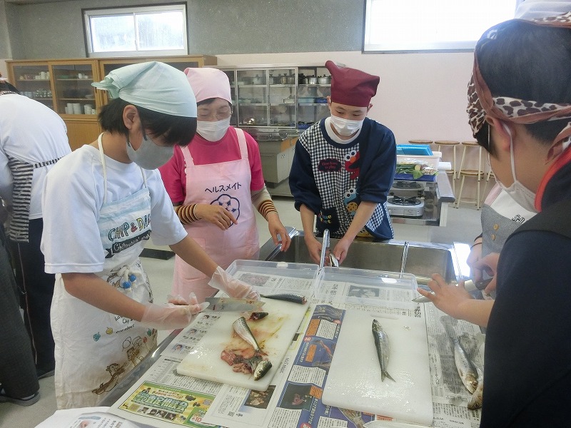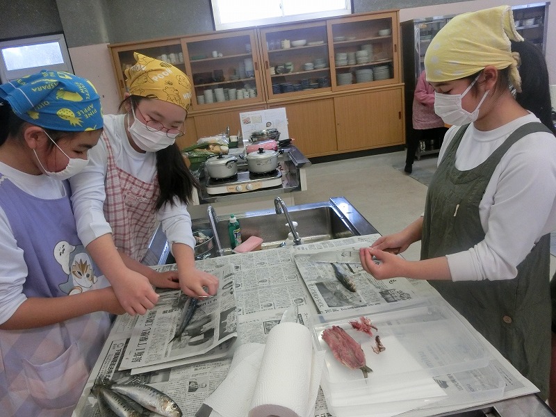1年生は二度目の調理実習でした。今回は「いわしの蒲焼き、ほうれん草のごま和え、豚汁」に挑戦しました。二年生と同様に、地域の食生活改善推進委員(食推さん)の方がご指導に来てくださり、いわしの裁き方など丁寧に教えてくださいました。おかげで難しい調理内容でしたが、手際よくでき、子どもたちも達成感を感じていました。ご指導ありがとうございました。