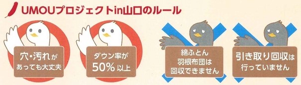 山口県共同募金会では、使わなくなった羽毛製品をリサイクルする「UMOUプロジェクトin山口」を実施しています。このリサイクルの収益金の一部が赤い羽根共同募金を通じて、地域の福祉活動に使われています。