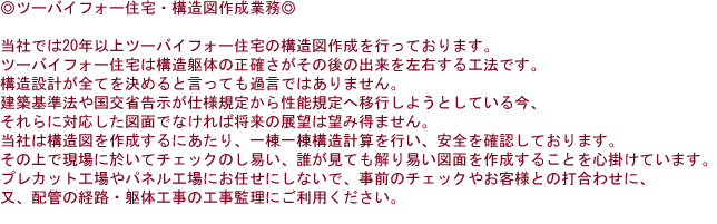 このページは、ツーバイフォー工法のハウスプラン、構造図・構造計算に関しての仕事依頼についての概要。 お問合わせメールアドレス: |