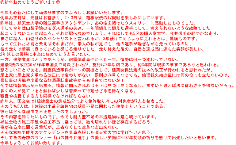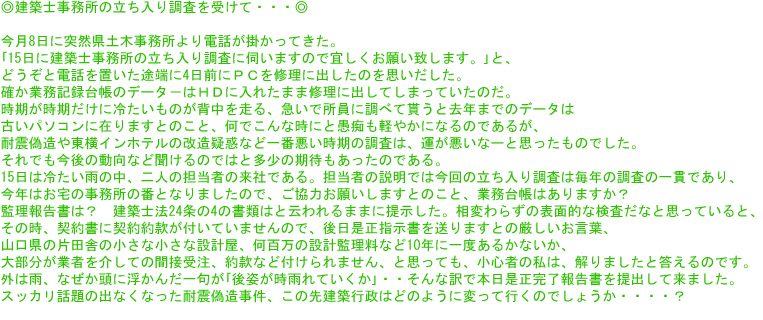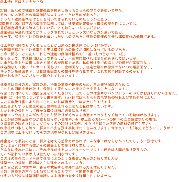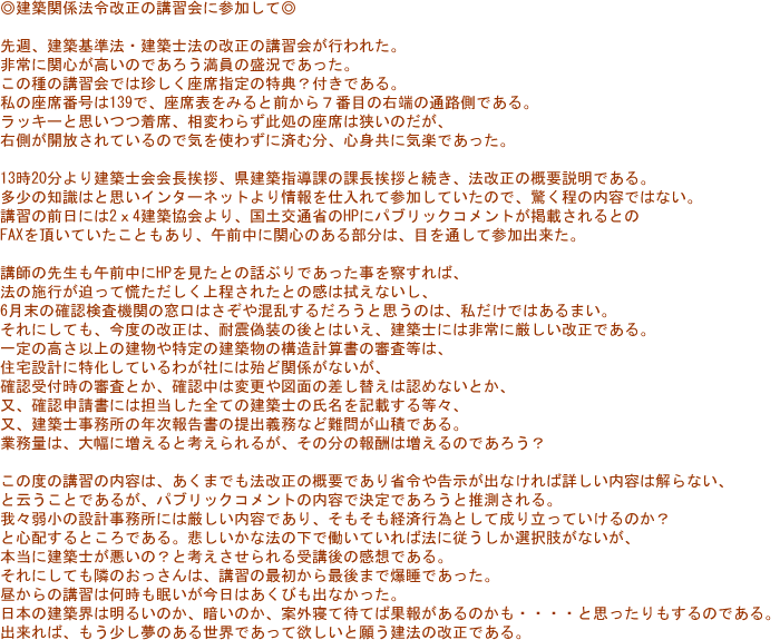 先週、「建築基準法・建築士法の一部改正法律の施行に伴う関係政省令等の解説」の講習会に参加してきました。この度の改正により一番大きく変わるのはやはり、構造計算等の関係であり、講習の時間割りもその半分以上が構造計算の方法等また審査の方法についての説明であった。業務の大部分を4号物件に限定している弊社には、余り関係ない話として聞いていたが、後半の建築確認・検査の厳格化等、又、建築士法の改正による図書の保存、罰則の強化等にいたっては、前途は多難と言わざるを得ない内容であった。まず「建築確認申請等には、担当した全ての建築士の氏名・資格等の記載の義務付け」ひとつ取ってみても、「壁量計算書を作成した」のみで、知らない内に構造担当として確認書に記載され、後年罰金ウン十万円+業務停止となることだって有り得るのだ。昨今木造の伏図はプレカット工場に委ねられている、工場に建築士がいなければ、その取扱いをどのようにすれば良いのか、うっかりすれば、名義貸しになりかねない?と思ったりするのである。色々考えれば当社だけでは解決出来ない事も多々あるように思われる。また、設計図書の保存期間が15年となり、電子データでの保存はだめと記載されている。早速、マイクロフィルムスキャナーを調べてみたら、なんと100万円以上の値段であった。当面は昔のように小屋裏にお世話になるかなーと、弱小事務所では苦笑して、納得するしかない。今度、小屋裏を覗いて見ようと思うのである。それにしても、改正法施行まで10日に迫った今日でも、まだ建築基準法が改正されることすら知らない工務店や建築士が存在するのは、どういうことであろうか。国や省庁は、なぜTV等を活用してもっと広く国民に知らせないのであろうか。官報など普通の人は読みません。建築基準法といえども家を建てる人だけが知っていれば良いと云うものではないと思う。隣に建物が建つ時、知っていれば多少なりともトラブルの早期解消に役立つかも知れない。専門的なことは別にして最低の知識としての建築基準法というものがあると思うのだが・・・!今、世間で騒がれている年金問題、・介護保険業者等の問題にしても、国民の目線に立った法律でなければ、有ってなきがごとき物である証明ではないかと思う。厳しく自己責任を問うのであれば、多くの人々が知らなければならない。徹底した情報の開示が必要であり、そしてその法律を作成し運用した方にも責任が問えるような法律でなければならないと思う今日この頃である。「分け入っても分け入っても青い山」  山頭火