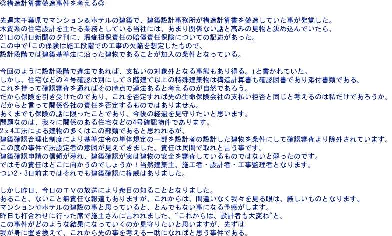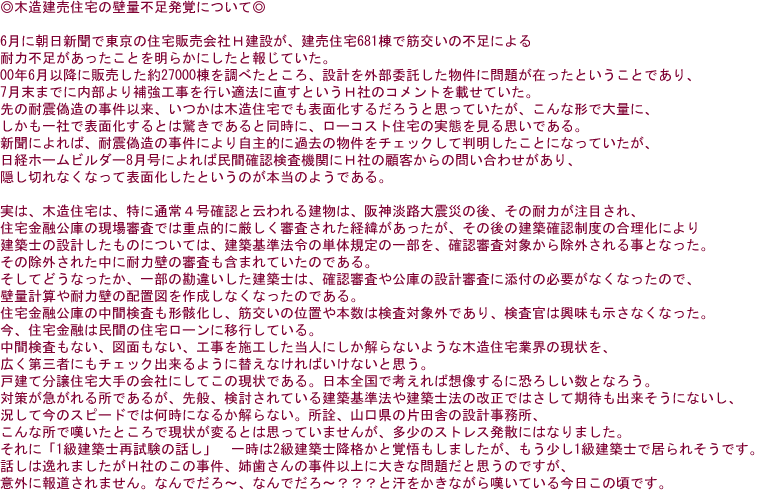姉歯元設計士による構造耐震偽装の問題、木造住宅での壁量不足事件など建築業界について物申す!