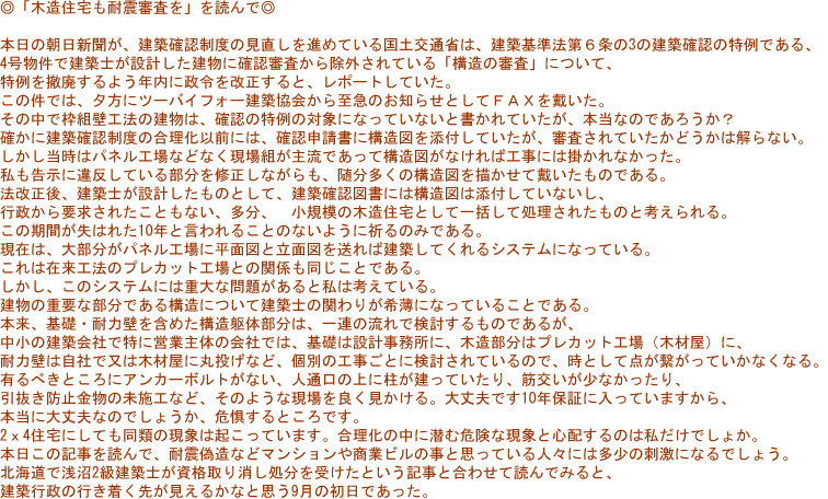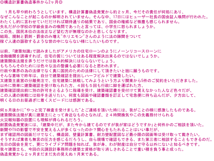 建築基準法改正法が施行されてから、やがて3ヶ月が経とうとしている。マスコミでは殆ど報道されていないが、建築確認審査の段階で混乱が続いているようである。弊社では改正後6件の確認申請を提出したが、その過程から改正法の問題を考えて見ようと思う。物件は全て4号建築物である。1件目は、法改施行直後の6月28日地元のU市役所建築指導課に提出した。確認申請書は、ERIのHPよりダウンロードして使用したが、この申請書が完全でなく申請書一面の印刷部分の訂正を指摘された。受付後2〜3の訂正があったが不適合にはならないで問題なく期限内に受け取ることが出来た。当初1件目は確認不適合による申請料のW支払いも覚悟していたが、U市建築指導課では案外柔軟に対応してくれることが判った。この経験がその後に生きて大きな自信になった。その後、U市には3件の建築確認を提出したが、建築確認の運用指針などの公示、Q&Aの後出しにより、添付書類の追加指示は有るものの、問題なく期限内に受け取ることが出来た。3件目に民間建築確認機関に提出する機会があり、8月のお盆前に約1時間かけて提出に出向いた。その時事前審査をやっている事を知らなかったので、受付をすませ手数料を払って帰ってきたら、程なく審査官より「事前審査でなくて良いか」と電話がかかってきた、一瞬迷ったが、往復2時間は時間の無駄と思ったので、本審査でお願いしますと答えた。「不適合の場合、審査料は返金しませんよ」と言われたが、以外に冷静に「良いです。勉強代と思います。」と言っちゃった。考えもなく言っちゃったのである。その後の1週間は、1件目の場合と違いどのような展開になるのかと「どきどき」であった、晩酌のビールの運命もかかる重大事であることに気づいたのはお盆休みの間であったが、その危惧もなく22日に、受け取り時に一箇所の訂正を条件に決済を頂いた。その後、Y市建築指導課にも提出した。対応はU市とほぼ同じであると感じたが、代願の物件であったので設計者の委任状を要求された。訂正がないので必要ないのではと頑張ったが、却下され仕方なく添付することとなった。法改正前より事前に情報を仕入れ、打ち合わせチェックリスト、図面記入項目のチェックリスト、確認書記入チェックリスト等の作成により、周到に準備をしてきたと思っても小さなミスや見落としは防げないものだと感じている。改正後、3ヶ月が経つこの改正の主旨は何か、こと4号建築物に関しては、建築確認審査において、又、安全の担保においては改正前となんら変ることがない。設計図は単に審査用の図面になっている。書類審査をどんなに厳しくしても所詮机上の上の話であろう。無意味な認定書の添付など、何の為に必要なのであろうか、私には理解できない。そんな事よりも、木造住宅等の、耐力壁配置図、接合金物図を添付する方が先ではないのか。審査を要しないのであれば、審査免除とゴム印を押せばいいではないかと思う。要は書類として残すことが重要であり、後年の改装、増築等の場合には証拠となる。第三者の目に留まると思えば設計者も嘘は書けない。中古住宅の売買にも重要なものである。耐震診断が叫ばれる今日、何年か先には、公費を使っての耐震診断が必要にならなければ良いなと思う改正法である。