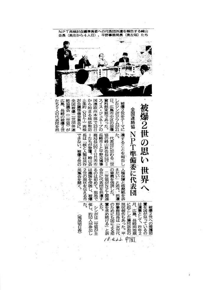 | <2022年> 12/23 長崎における被爆二世集団訴訟 12月23日に控訴 報告 12/12 長崎における被爆二世集団訴訟不当判決 声明 報告 10/29 長崎における被爆二世集団訴訟・判決事前集会 10/16 広島、「被爆二世の援護を求める集団訴訟」総決起集会 8/31 第10回NPT再検討会議帰国報告会 8/7〜9 被爆77周年原水爆禁止世界大会長崎大会 8/4〜6 被爆77周年原水爆禁止世界大会広島大会 8/2〜5 国連本部で被爆二世や将来世代を含む核被害者の人権確立と核廃絶を訴える − 全国被爆二世協 第10回NPT再検討会議代表団派遣 − 報告 7/30〜31 被爆77周年原水爆禁止世界大会福島大会 7/27 被爆二世集団訴訟 広島 最終弁論 7/19 長崎地裁で弁論が終結、12月12日判決 − 被爆二世集団訴訟 − 報告 7/13 ウィーン帰国報告会 7/1 国連人権理事会における普遍的定期審査(UPR)第42会期に向けて 「日本における原爆被爆二世の人権、及び日本政府の取り組みに関する報告書」を提出 6/21〜23 ウイーンでの核兵器禁止条約第1回締約国会議及び関連行事に対する 全国被爆二世団体連絡協議会としての取り組み 報告 4/2 2022全国被爆二世団体連絡協議会総会 - 報告 新聞記事 要請書 2/28 原爆放射線の影響を身体に受けている可能性は否定できない − 被爆二世集団訴訟 長崎 専門家の証人尋問 − 報告 新聞記事 1/31 いよいよ放射線の遺伝的影響に関する専門家証人尋問、そして弁論終結へ − 被爆二世集団訴訟 長崎 第8回弁論準備 − 報告 1/10 市民社会から核不拡散条約(NPT)締約国への共同声明全国被爆二世団体連絡協議会も この声明の賛同団体に加わる 詳細はこちら |