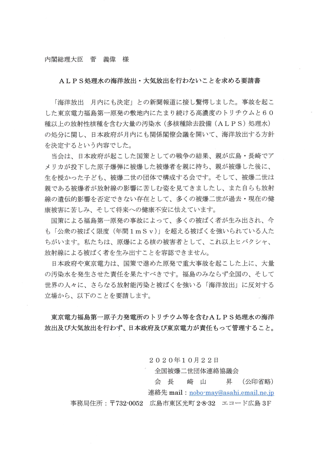 以下の要請書を、菅義偉内閣総理大臣、梶山弘志経済産業大臣、平沢勝栄復興大臣、茂木敏充外務大臣、野上浩太郎農林水産大臣、小泉進次郎環境大臣、加藤勝信内閣官房長官へFAXやメールにて送りました。