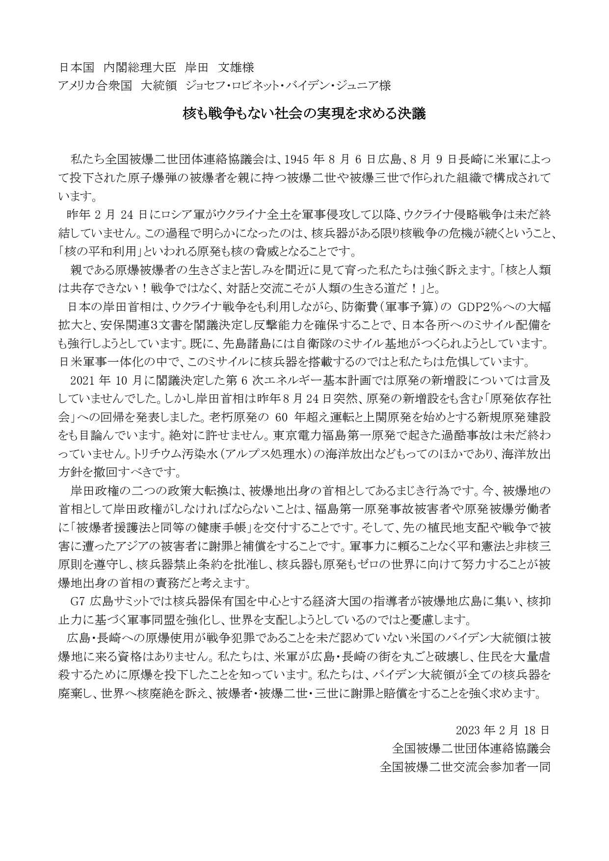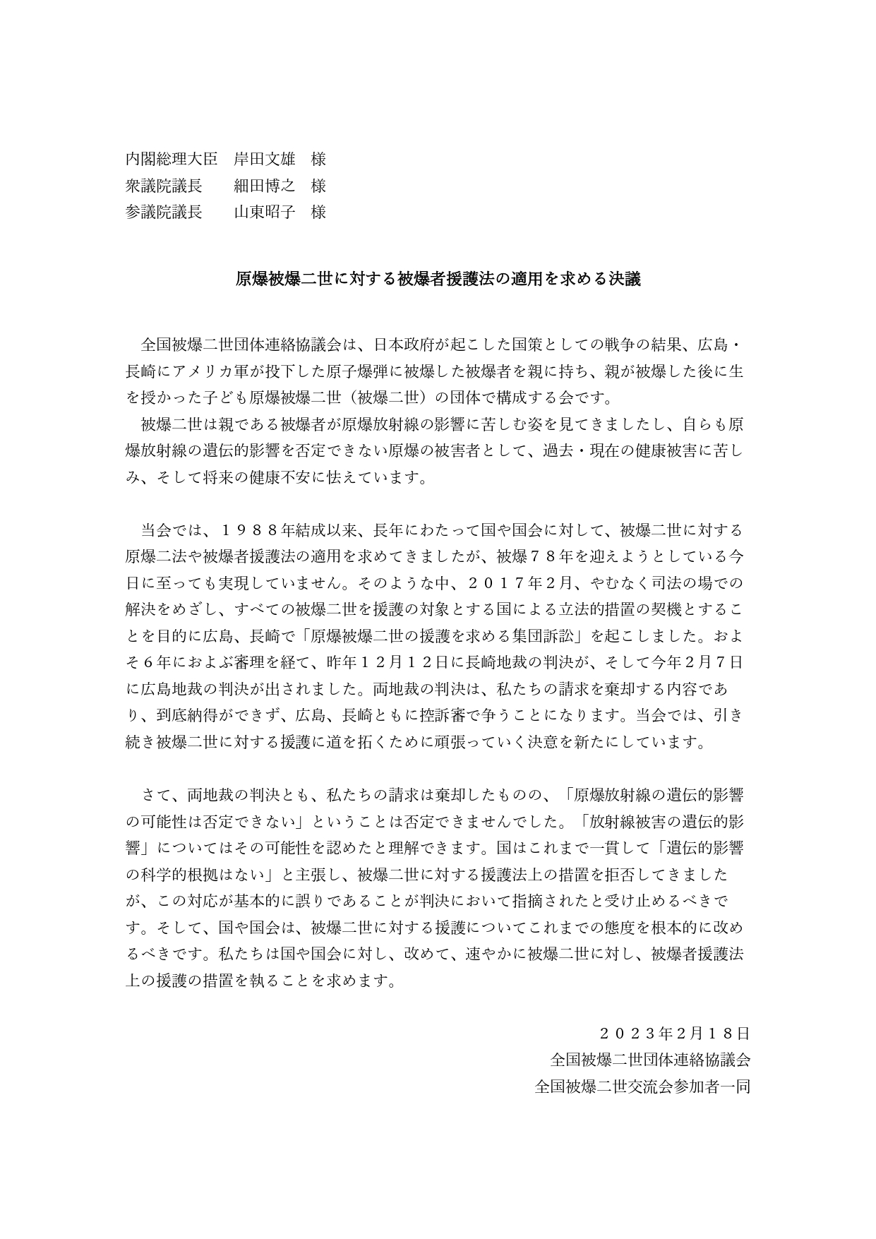 | 決議文のPDFはこちら 原爆被爆二世に対する被爆者援護法の適用を求める決議 核も戦争もない社会の実現を求める決議 |
