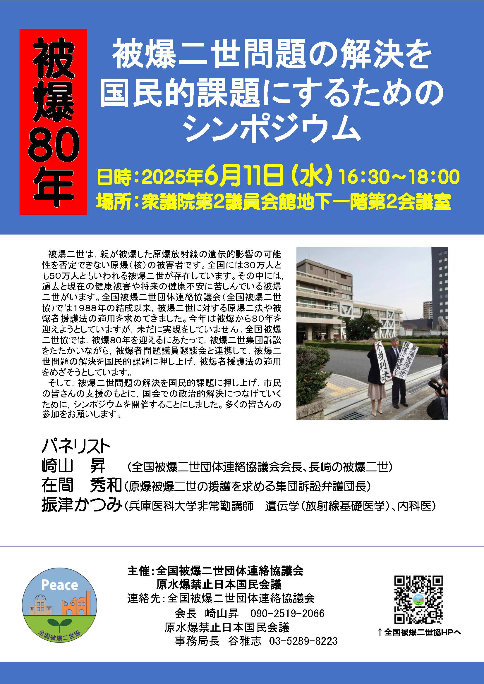 全国被爆二世団体連絡協議会(全国被爆二世協)では、被爆80年を迎えるにあたって、被爆二世問題の解決を、国会での政治的解決につなげていくため、東京(院内)、広島、長崎で連続シンポジウムを開催することにしました。そして、東京(院内)でのシンポジウムを6月11日(水)16時30分〜18時、衆議院第2議員会館地下一階第2会議室で原水爆禁止日本国民会議(原水禁)との共催で開催しました。