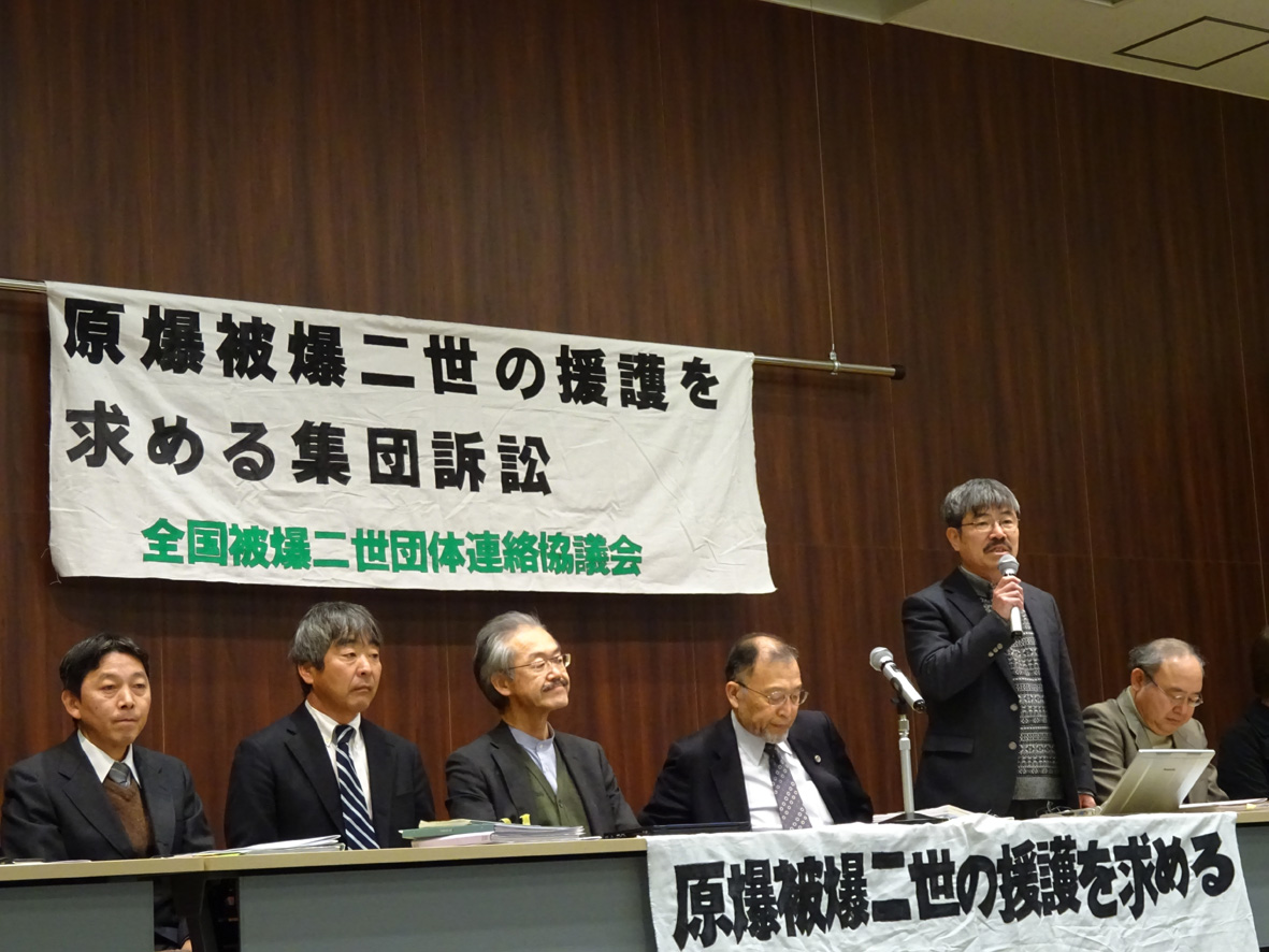 | はじめに 米軍による原爆投下から72年が経った。被爆者の平均年齢が80歳を越えて死去したり、高齢のため被爆体験を伝えることができなくなっている。 全国被爆二世団体連絡協議会(全国被爆二世協)は、1988年の結成以来、被爆体験の継承、被爆二世・三世への援護法の適用、在外被爆者・二世との連帯などを掲げて闘い続けてきた。 そして今、被爆二世が全国各地で戦争や核の被害を許さないために立ち上がり、核被害の実相を社会に訴えてきている。 歴史的一歩、被爆二世集団訴訟の開始 被爆二世が全国に約50万人存在すると言われている。しかし、国は一度も被爆二世の実態調査をしたことが無いので、正確な人数はわかっていない。今、国が被爆二世に行っているのは、単年度措置のガン検診も無い健康診断のみだ。 私たちは、日本の被爆者や在外被爆者が裁判を通じて、生きる権利を勝ち取ってきた歴史に学び、本年2月被爆二世集団訴訟に立ち上がった。 全国被爆二世協は、歴史的な一歩を踏み出したのだ。2月17日広島地裁に22人が、2月20日長崎地裁に25人が「原爆被爆二世の援護を求める集団訴訟(被爆二世集団訴訟)」を提訴した。原爆放射線の次世代への影響を問い、国の立法による援護対策を求める初めての訴訟だ。 この訴訟は、原爆被爆二世の問題にとどまらず、世界の核被害者の次の世代の問題解決につながる。核兵器の非人道性の最たるものの一つが放射線の次世代への影響であることを訴えたい。このことが世界の共通認識となれば、核(原発も含む)を廃絶する大きな力になるはずだ。 被爆者や被爆二世の現実を知らない人達に、被爆者や被爆二世がどのように原爆被害の恐怖と闘いながら、自らの人生に誇りを持って生きてきたかを知って欲しい。 二度にわたる被爆二世の意見陳述と弁護団の奮闘 第1回口頭弁論は広島地裁で5月9日、長崎地裁で6月5日に行われた。 広島地裁では、中学校教諭の占部正弘さんは、黒いシミや声のかすれが、父親の被爆後の症状と似ており原爆の影響ではないかと心配していることや直接生死には関係なくても健康不安を持っている被爆二世がいることを知って欲しいと話された。 平野事務局長は、全国被爆二世協の運動の歴史と、現時点での放射線影響研究所の調査結果を根拠に放射線の影響を過小評価して、被爆二世の健康被害の現実に向き合おうとしない国の姿勢を徹底的に批判した。 在間弁護士は、国が核兵器の放射線による被害を戦後70年以上にわたって、いかに隠ぺいしてきたかを、原爆二法の成立過程から1995年に成立した被爆者援護法の制定に至るまでの歴史、そして原爆症認定集団訴訟や在外被爆者訴訟の歴史を紐解く中で、明らかにした。つまり本来被爆者として援護の対象にされるべき被爆二世が、その埒外に置かれてきたことが違法であると訴えたのだ。 第2回口頭弁論と追加提訴第1回口頭弁論は、広島で8月22日、長崎では9月26日に行われた。現在追加提訴者を合わせて、広島原告26名、長崎原告26名となった。 広島地裁では、山口県在住の森田修さんが、提訴の報道を偶然テレビで見て、自分も二世として何かをしなければいけないと思い、原告に加わる決断をしたことや、幼少の頃から病弱で、5歳年下の弟もほぼ同じ時期に前立腺がんと狭心症を発症したことで、被爆の影響ではないかと不安になったことなどを述べた。 提訴や裁判のニュースが報道されると、全国被爆二世協には相談のメールや電話が来た。二世自身の病気だけではなく、子ども(三世)についての不安もせつせつと訴えてくる。これまで誰にも言えなかった健康不安を訴える場所ができた。この裁判は被爆二世の拠り所にもなっている。 被告国の主張を打ち砕こう! 私たち被爆二世の訴えに対して、被告国は9月26日長崎地裁と10月26日広島地裁において原告の請求の棄却を求める答弁書を陳述した。 その中で被告国は、@被爆二世を被爆者援護法の適用対象としない立法不作為が国家賠償法1条1項の適用上違法の評価を受ける余地はない。A親が原爆の放射能に被曝したことによって被爆二世が発がんリスク増加など遺伝的影響を受けることは科学的に証明されておらず、被爆二世が親の放射線被曝による遺伝的影響を受けることを前提として被爆者援護法が憲法違反であるとする原告らの主張は、前提を欠き失当である,と主張した。 私たちは、この国の主張を認めることはできない。徹底して反論し、私たち被爆二世の現実を社会に知らせていく。皆さん、被爆二世集団訴訟へのご支援、ご協力を! |
