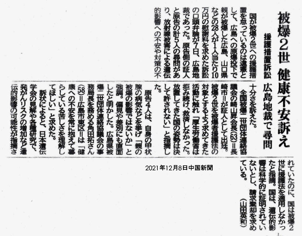 | 2021年12月7日、広島地裁で、被爆二世集団訴訟の証拠調べが行われました。始めに、全国被爆二世団体連絡協議会(全国被爆二世協)の崎山昇会長が、二世運動と行政の対応について証言し、その後、原告4人の本人尋問が行われました。 崎山会長は、2021年9月1日に提出した意見書(1)(2)(3)に基づいて、主に以下の内容について証言しました。 原爆医療法成立目前、1957年3月の二世問題に関わる重要な国会でのやりとりやその後の政府答弁のこと。1979年から実施されている「被爆二世健診」はあくまでも調査・研究の一環であり、全く不十分な施策だと評価していること。1988年12月結成の全国被爆二世協が、援護法制定運動に参加し、二世・三世への原爆二法の適用を求めたこと。1989年には「被爆二世・三世条項」を含む援護法が参議院で可決されたが、衆議院で廃案になったこと。1992年にも再度法案が提出され同様の結果だったこと。1994年村山内閣の時に援護法が制定されたが、「被爆二世・三世条項」は盛り込まれず、「附帯決議」がされたこと。1997年に放射線影響研究所が「被爆二世健康影響調査計画」を発表し、国の二世対策につながるよう交渉を重ね、厚生省が「態度表明」を行ったこと。2001年から2004年にかけて、全国被爆二世協では、「附帯決議」と「態度表明」に基づいて、厚労省に対して、被爆二世への適用を明記した援護法の改正を求め続けたが、遺伝的影響があるとの「科学的知見」が得られていないことを理由に切実な要求を拒み続けたこと。2001年から国会議員に働きかけ、立法による解決をめざそうとしたこと。2006年から「原爆被爆二世の援護を求める署名」を全国的に取り組み、累計378,129筆を厚労省に提出したが全く動かなかったこと。2007年に放影研の解析結果が公表されたが、全国被爆二世協では、「二世に対して原爆放射線の遺伝的影響がない」ということを示すものではないことなど声明を発表したこと。2009年民主党政権が誕生しても、2012年に自民党公明党連立政権に戻っても厚労省の態度は全く変わっていないこと。1979年から調査・研究の一環として、被爆二世健康診断事業を行っているが、当事者の長年の要求にもかかわらず、対策については全く行われてこなかったこと。意見書(3)では、本来であれば、国がどこの自治体に住んでいても同じ二世として、同じ施策が受けられるような立法的措置を行うべきところ、それを自治体に押し付けてきた実態を明らかにしようとしたこと。今年度から被爆二世健康診断事業の一環で各自治体が「被爆二世健康記録簿」を発行できるようになったが、二世に対する援護対策といえるものではないこと、国として立法的措置を行わないために、居住する自治体によって二世に対する対応に差が生じること。専門家から、放射線の遺伝的影響は否定できない、可能性があるとの指摘がなされてきた中、苦しんでいる被爆二世を放置してきたことは決して許されることではないこと。裁判所には、二世が置かれた状況を理解していただき、二世の法的援護、立法的措置につながるような判断をお願いしたいこと。 この尋問調書は、長崎地裁へも証拠として提出されます。そして、被爆二世集団訴訟も2022年2月28日(月)に長崎地裁で予定されている遺伝的影響に関する専門家証人の尋問で最大の山場を迎え、最終弁論・結審へと向かうことになります。 |