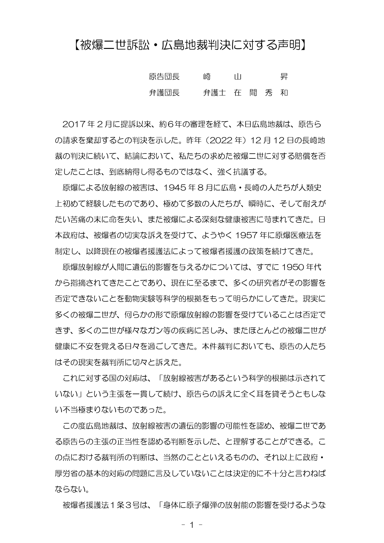 | 被爆二世集団訴訟 広島地裁 不当判決!! 運動の力で原爆被爆二世の援護の道拓こう! 第1に広島地裁判決は、広島の地で「黒い雨」高裁判決を否定したうえ、長崎地裁判決よりも後退した内容であり、到底許すことはできない。 第2に、原告全員が各々の思いを証書として提出しているのに、全くくみ取っていないことは、非常に悔しい。 最後に、これからも裁判を闘う中で、仲間を増やして、運動を盛り上げていきたい。 全国被爆二世団体連絡協議会 事務局長 平野克博 |
