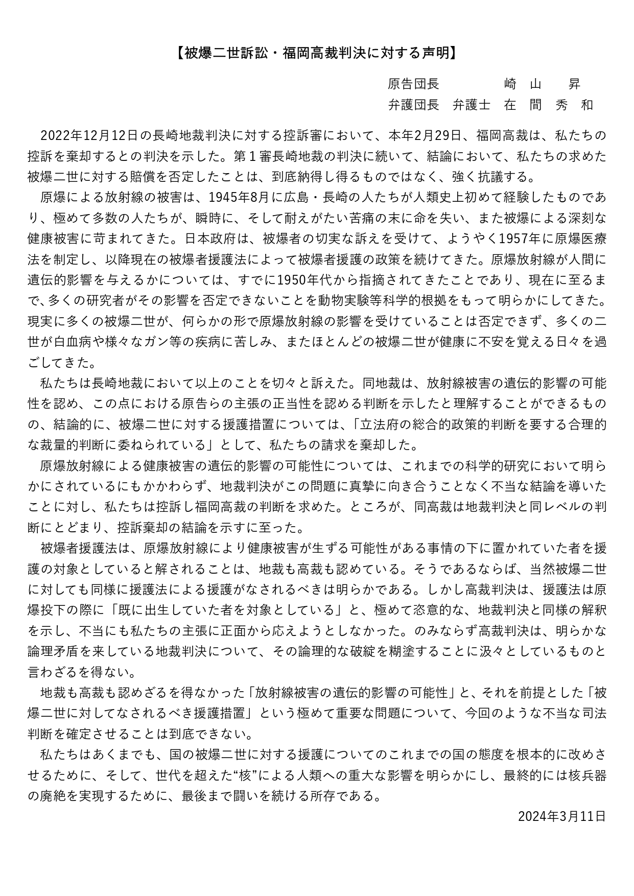 | 2024年2月29日14時30分から福岡高裁で長崎における被爆二世集団訴訟の控訴審判決が言い渡されました。言い渡しはわずか1分、高瀬順久裁判長が「本件各控訴をいずれも棄却する。控訴費用は控訴人らの負担とする。」と読み上げ、裁判官ら(野々垣隆樹、古川大吾)は法廷を立ち去りました。弁護団長の在間秀和弁護士は16時から福岡県教育会館で行われた報告集会で「想定した判決の中で最悪の判決である」と述べました。 (判決要旨・骨子)裁判所の判断 1 憲法13条違反について 原爆の放射線による遺伝的(継世代的)影響が否定できない健康不安に対する国の援護を求めることは、憲法13条に包摂される権利として抽象的であり、そもそも同条から国に対して立法措置を求める権利を導き出すことはできない。 2 憲法14条違反について 被爆二世については、原爆による放射線の遺伝的影響は証明されていない。これを肯定する研究結果もあるものの、これまでの調査研究では、ヒトに対する症例的調査研究、DNA調査、全ゲノム解析による研究において、否定的な研究結果が複数発表されている。また、被爆者の子供に死亡率、がん発症率の増加は認められない。控訴人ら主張に係る被爆二世に対する原爆被爆の放射能により健康被害が生じる可能性について、その健康被害の可能性の前提となるべき原爆被爆による放射線の影響(被爆二世については遺伝的影響)は、被爆者援護法所定の「被爆者」又は被爆者援護法附則17条の「みなし被爆者」のそれらとを比較した場合、その基礎となる医学的、科学的知見の現状(現時点における到達点)等において顕著な差異がある。 そうすると、被爆二世について、被爆者援護法所定の「被爆者」又は被爆者援護法附則17条の「みなし被爆者」に含め、同等の措置を講じるか否かについては、国会の総合的政策的判断を要する合理的な裁量的判断に委ねられているところ、そうしないことが、合理的理由のない差別的な扱いとはいえず、憲法14条1項に違反しない。 3 以上によれば、控訴人らの請求を棄却した原判決は相当であり、本件各控訴はいずれも理由がない。 今回の控訴審判決は、長崎地裁判決よりも更に後退した判決となりました。国が上告しなかった「黒い雨 広島高裁判決」(以下「黒い雨判決」)は、「原爆の放射能により健康被害を生ずることを否定できないものであったこと」が認められると、被爆者援護法1条3号(3号被爆者:身体に原子爆弾の放射能の影響を受けるような事情の下にあった者)に該当すると認定しました。私たちは、その判決を踏まえて、被爆二世も原爆放射線の遺伝的影響の可能性を否定できないことを立証し、国会が、被爆二世を第五の被爆者として、被爆者援護法と同等の援護措置を行う立法をすべきことや「みなし被爆者」と同等の措置を行うべきことを主張してきました。長崎地裁判決は、「原爆の放射線による遺伝的(継世代)影響については、その可能性を否定できないというにとどまる」と「可能性を否定できない」と認めながらも、私たちの請求は棄却しました。しかし、福岡高裁判決は「遺伝的影響は証明されていない」として私たちの請求を棄却しました。国は、上告しなかったにもかかわらず「黒い雨判決」に従わず、未だに1980年の基本懇報告に基づく科学的・合理的根拠による被爆者援護行政を続けています。今回の判決は、私たちに科学的・合理的根拠、遺伝的影響があることの証明を求める国の立場に立った判決でした。そして、広く原爆の被爆者を救済しようとする被爆者援護法の立法趣旨に沿った「黒い雨判決」を否定し、なかったことにしようとする判決だったと言えます。 私たちは、判決後の報告集会で、上告し、引き続き原爆被爆二世の援護に道を拓くために頑張っていく決意を新たにしました。そして、3月11日に上告・上告受理申立を行いました。 (全国被爆二世団体連絡協議会会長、被爆二世集団訴訟原告団長 崎山昇) |
