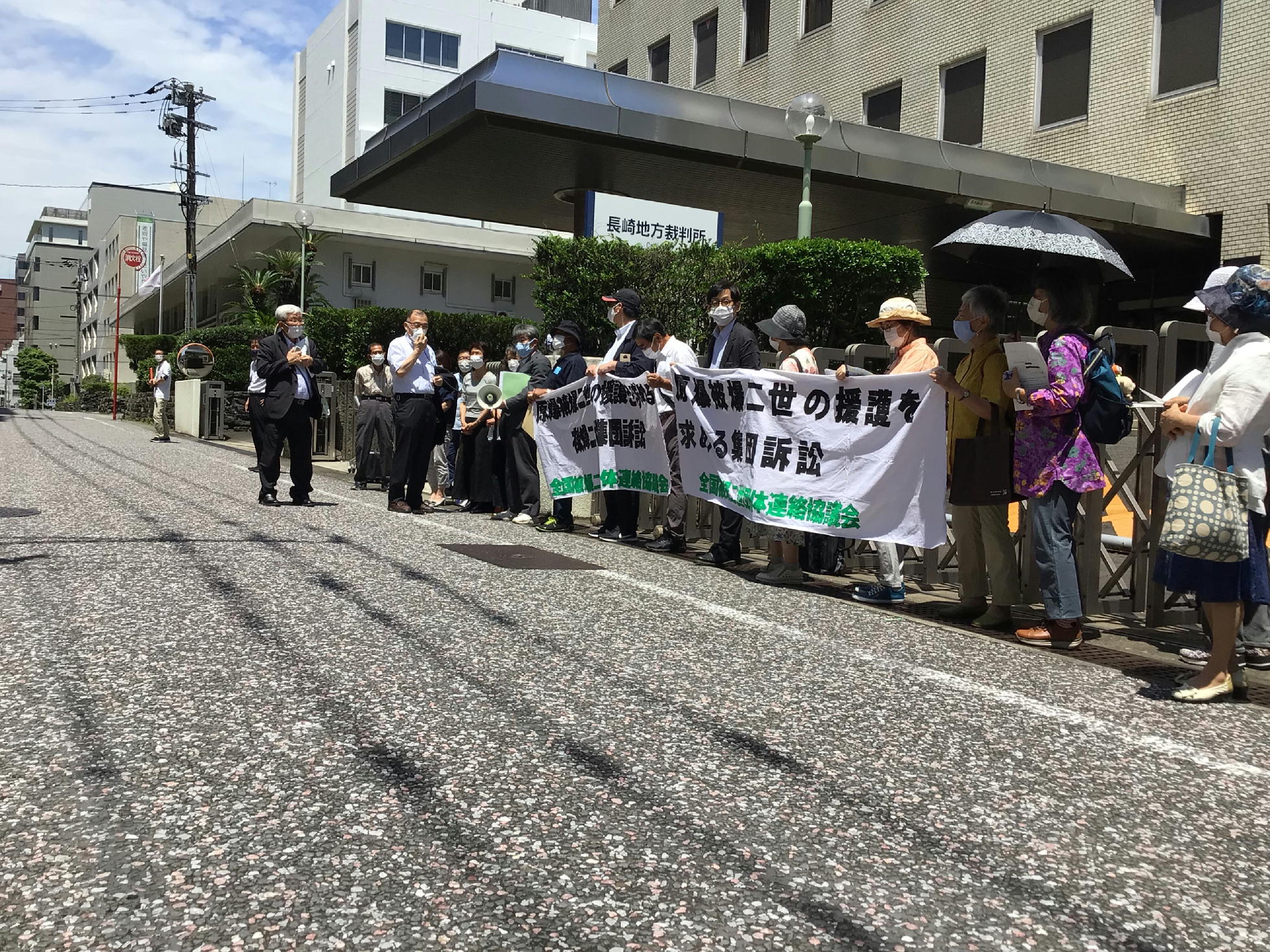 | 2021年6月21日14時から、長崎地裁で被爆二世集団訴訟の証拠調べがあり、原告4人の本人尋問が行われました。そして、それぞれが被爆二世が置かれた状況を裁判官に訴えました。 長崎県被爆二世の会会長の丸尾育朗さん(1947年10月18日生まれ、母が1号・2号被爆者)。「2018年6月にすい臓ガンの切除手術を受け、今年2月ガンの再発がわかり、3月から抗ガン剤治療を開始し、確実に治療実績が上がっている。」開設した被爆二世相談窓口に被爆者や一般の人から寄せられた相談の内容を紹介し、「長崎の医者は被爆二世の死を「影響がある」と言えない実態がある」と指摘した。また、親戚や同僚の二世が若くしてガンで亡くなった状況を踏まえ、被爆二世健診でのガン検診の重要性を訴えた。そして、最後に「私の一番の親友が放影研の臨床調査の対象者だったが、心臓病、肺ガン、その後、咽頭ガンに罹った。二人の会話の終わりは「死ぬなよ」という言葉だった。裁判官が意見を聞いてくれて有り難い。生きて判決を聞きたい。心から感謝している。」と語った。 続いて、箕田秀美さん(1957年12月3日生まれ、父が2号被爆者、母が3号被爆者)。「私が被爆二世であることをはっきりと自覚し、不安を抱いたのは第一子(長女)を妊娠して切迫流産で入院した時。被爆者である両親も大変心配していた。長女は無事に生まれたが、5歳の時に腎臓病、原因不明の難病「ネフローゼ症候群」を発症した。私の両親は、長女の発病のことを知って心底落ち込んでいた。被爆の影響が孫娘に現れたと考えずにいられなかったのだ。父は亡くなったが、最後までガンの治療を受けていた。二世がガンにならなければよいが、孫の難病が続かなければよいがと言っていた。私も自分自身がガンになるのではないか、三世もガンになるのではないかと不安をもっている。世の中の人にそのような苦しみを知ってほしい。」と訴えた 次に、阪口博子さん(1949年7月22日生まれ、母が1号・2号被爆者)。「母は、59歳の時、直腸がんを患い、手術をし、その後肺に転移が見つかり、64歳で亡くなった。その時、原爆の影響だと確信し、自分にも影響があるのではないかと、初めて被爆二世であることを強く意識した。40代になってからは、急に血圧が上がり、薬を服用するようになり、今も続いている。4年ほど前、二世健診で甲状腺の異常を指摘され、現在半年に1回血液検査をしながら経過観察中。治療費の負担を感じている。被爆二世で同じ年のいとこがいたが、20代前半で亡くなった。被爆二世の友人で40代はじめに亡くなった人もいる。悪性リンパ腫で2年闘病した。子二人と孫二人には、何もなければよいがと心配している。一番心配なのがガン。健診を充実しガン検診を受けられるようにし、被爆者と同様の病気になったら、被爆者と同様の援護ができるようにしてほしい。」と訴えた。 最後に、野口伸一さん(1947年7月18日生まれ、母が1号被爆者)。「若い頃は病気をしたことはなかったが、40近くに血圧と血糖値の異常を指摘され、薬を飲むようになった。脳梗塞を発症し治療。2017年と2018年に胃ガンの摘出手術を受けた。被爆二世であることを意識し始めたのは、一番下の弟が急性白血病で26歳で亡くなった時から。2つ下の弟は前立腺ガンで抗ガン剤治療中、妹は難病で病院通い。もう一人の弟も病院通いをしていた。母方のいとこも4人、若くして病気で亡くなった。戸町中学校の同級生は400人いるが、ほとんど二世。70歳の時の同窓会時点で44〜45人が亡くなっていた。3人の子がいる。長女は結婚し、初産は死産、次に生まれた子は未熟児。原因不明。長女は子宮筋腫で病院にかかっているようで心配。2ヵ月に一度の検査の費用は1万円以上かかり大変。二世に医療費の支給がないのは全く不十分。26歳で亡くなった弟にいい報告ができるようにお願いしたい。」と訴えた。 その後、進行協議が行われ、次回弁論準備は8月10日(火)15時から、ウェブで行われることになりました。1ヵ月程度後に提出予定の被告側の意見書と準備書面(遺伝的影響に関するもの)を受けて、その後の進行について協議されることになります。遺伝的影響に関する証人尋問が年内か年明け、その後最終弁論という流れになりそうです。 原告本人尋問という大きな山を一つ越え、証人尋問という二つ目の山をめざし、二世訴訟もいよいよ終盤へと向かいます。 引き続き皆さんのご支援とご協力をお願いします。 全国被爆二世団体連絡協議会活動支援カンパへご協力を 【振込先】中国労働金庫本店営業部 普通預金6192565 全国被爆二世団体連絡協議会 会長 崎山昇 |