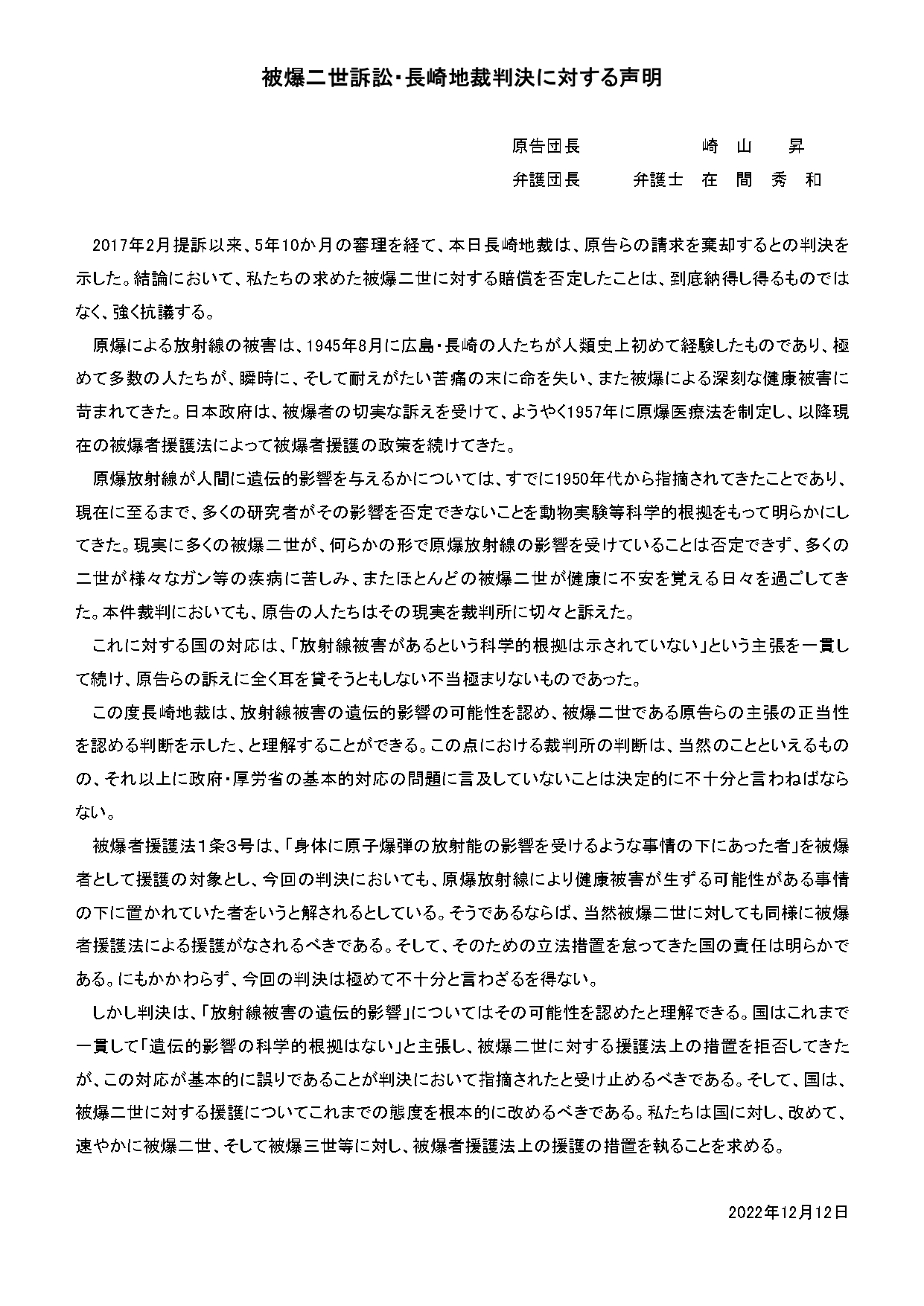 | 12月12日(月)10時から長崎地方裁判所において、「原爆被爆二世の援護を求める集団訴訟」の歴史的な判決が言い渡された。天川博義裁判長は「原告らの請求を棄却する。・・・」と主文を読み上げ、立ち去った。不当判決の主な内容は以下の通り。 「被爆者援護法は、原爆の放射能により健康被害を生ずる可能性がある者についても、これを援護の対象とする趣旨であると解されるところ、可能性があるにとどまる者について援護の対象とすることは、・・・広い意味の国家補償ないし社会保障法的見地に由来するものと解される。そして、原爆の放射線による影響が未解明な中で、その援護の対象を定め、外延を画することは、この点に関する高度に専門的技術的な知見を基礎としつつ、・・・援護法の趣旨を踏まえた総合的政策的判断を要するというべきである。」「被爆者援護法1条3号の「被爆者」は、その身体に直接被爆した原爆の放射能により健康被害が生ずる可能性がある事情の下に置かれていた者をいうと解されるのに対し、被爆二世については、その身体に直接原爆の放射能を被曝したという事情は認められず、原爆の放射線による遺伝的(継世代)影響については、その可能性を否定できないというにとどまる。このような両者の差異に照らすと、・・・援護法の趣旨を拡充して、被爆二世を援護の対象に加えるか否かや、その場合の援護の在り方等については、・・・立法府の総合的政策的判断を要する合理的な裁量的判断に委ねられているというべきであり、被爆二世を援護法の被爆者に含めず、同法による援護の対象としないことが、合理的理由のない差別的取り扱いに当たるとは認められない。」「・・・以上のとおり、被爆二世に対する立法不作為は、違憲(憲法14条違反)であるということはできず、・・・国賠法1条1項の規定の適用上、違法の評価を受けるものではない。」 不当判決ではあったが、さすがに天川裁判長も、「原爆放射線の遺伝的影響の可能性は否定できない」ということを否定することはできなかった。政府が受け入れた黒い雨・広島高裁判決では、「原爆の放射能により健康被害が生ずることを否定することができない事情の下に置かれていた者」を被爆者と認めた。その判決に従えば被爆二世も援護法の対象となるべきことは明らかである。しかし、天川裁判長は、国側の主張にそった判断を下した。 私たちは、原爆放射線の遺伝的影響は否定できないことを認めた今回の歴史的判決を踏まえ、被爆二世の援護に道を拓くよう頑張っていく決意を新たにした。 そして、12月14日、控訴することを決定した。 |