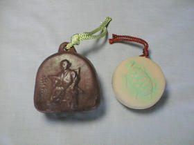 「古銭鈴」 今から千二百年余り昔、咲く花の匂うが如しといわれた奈良の時代に、日本で初めての貨幣「和同開珎」が造られました。この日本最初の貨幣を造ったところが、今なお昔の役所の名を伝えている山口市鋳銭司です。 「和同開珎」という銭名は、人々が平和にむつみ合い、国も家も富み栄えるという意味だといわれています。したがってこの目出度い銭をそのまま鈴としてつくり、皆様の平和と富貴を祈り、お手元にお贈りする次第です。 古銭ゆかりの鋳銭司で造られたこの鈴を、平和と富貴のマスコットとして座右において下さいませ。 |