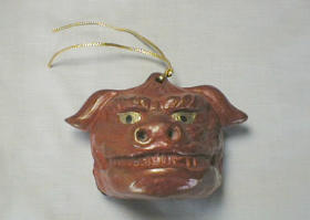 「代神楽獅子頭鈴」 室町時代、山口の大守大内義興は、伊勢の大神宮を山口に勧請しましたが、これは西日本唯一の大神宮として大いに栄えました。このとき一緒に受け入れられたといわれる伊勢代神楽、すなわち獅子舞は現在も山口を中心に各地に伝わり、舞われています。 この鈴はその由緒ある代神楽の獅子頭をかたどり、皆様の厄を除け、幸運をもたらすしるしにと謹製したものであります。どうかご家庭の平和のお守りとしてご愛玩下さいますようお願いいたします。 |
