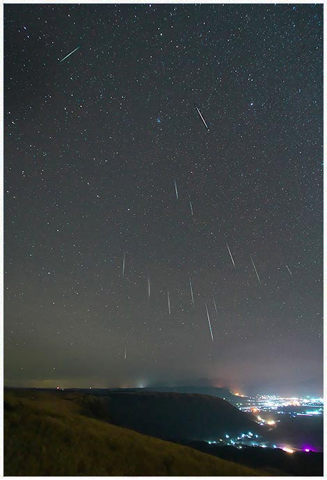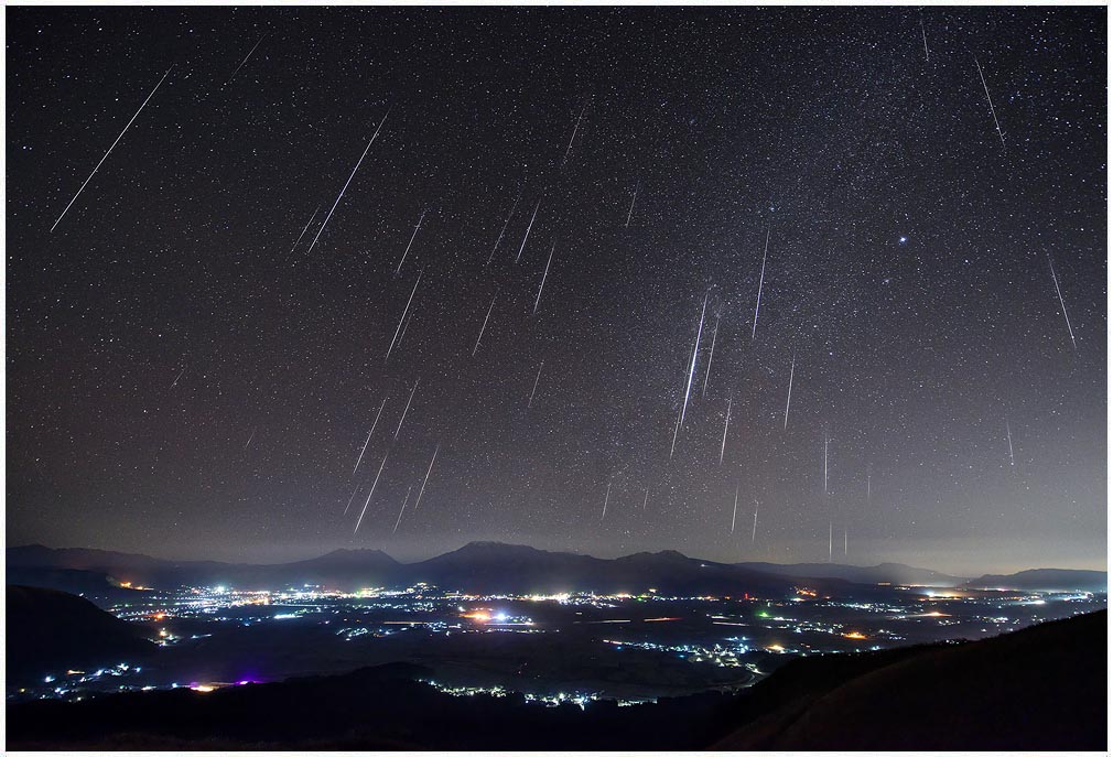 幸運にも天候は良さそうなので、通いなれている久住へ出かけた。久住連山を背景に降り注ぐ流星を