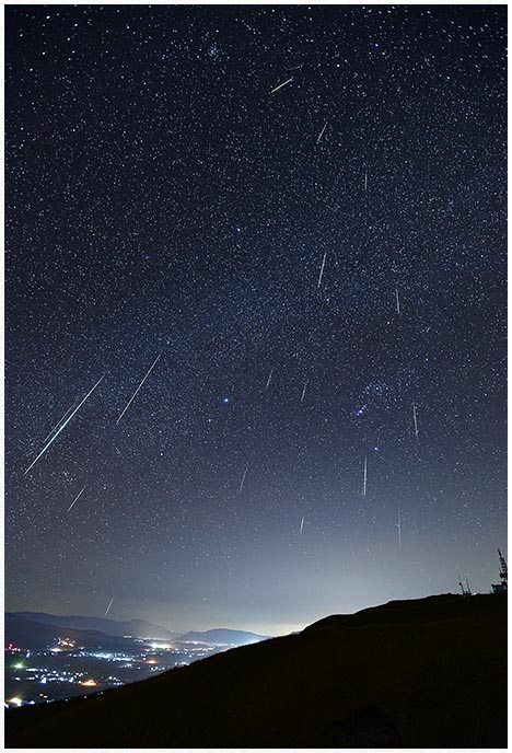 フレームをかすめた流星まで数えると、96個確認できた。その内明るく写った流星約40個合成