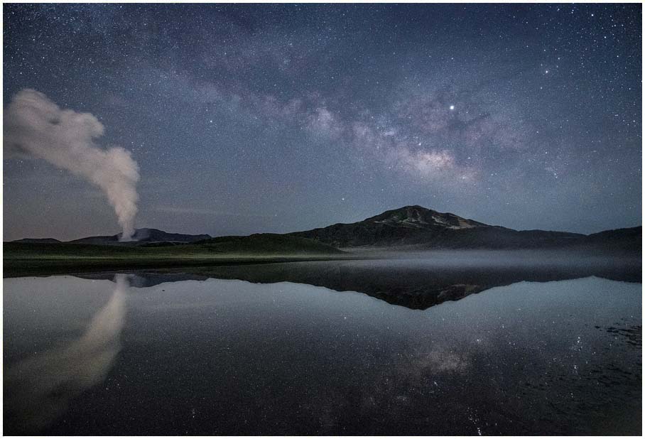 銀河が昇り始め期待が膨らんだが、池の上にぼんやりと靄が。窪地で風が無いのでこんなこんな事に!