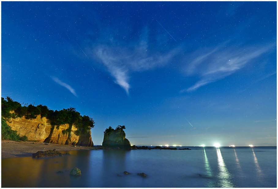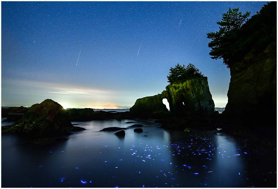満ち潮に掛かり、撒いた餌に反応して海蛍が光始めた。大きな火球が南側を流れたが、残念!