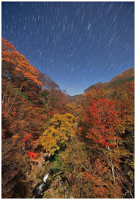 3日後訪ねたら落葉が進んでいた。運よく流れ星が飛び込んでくれた。
