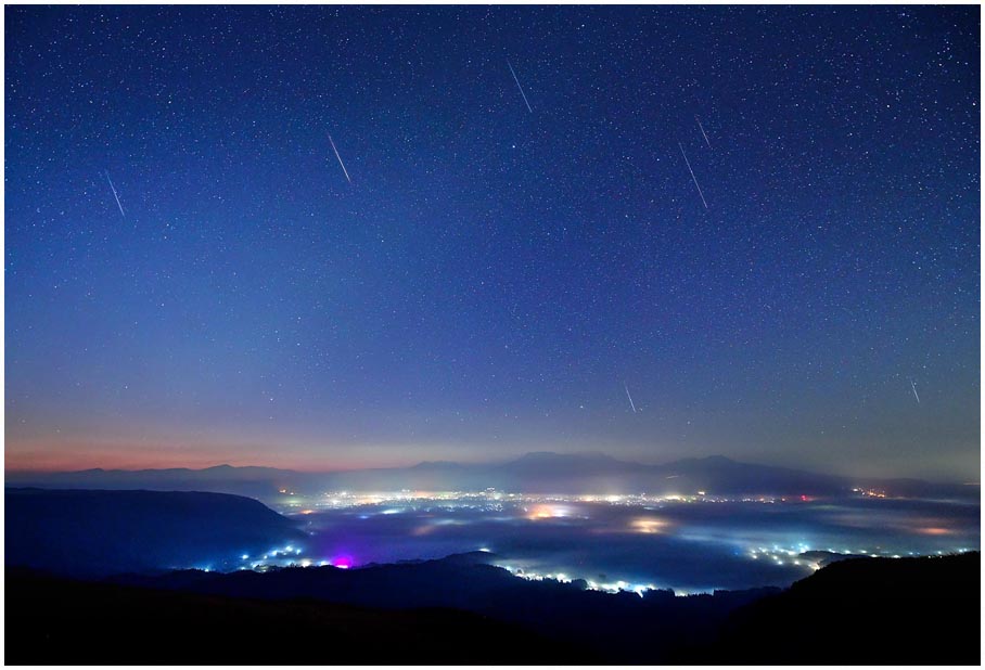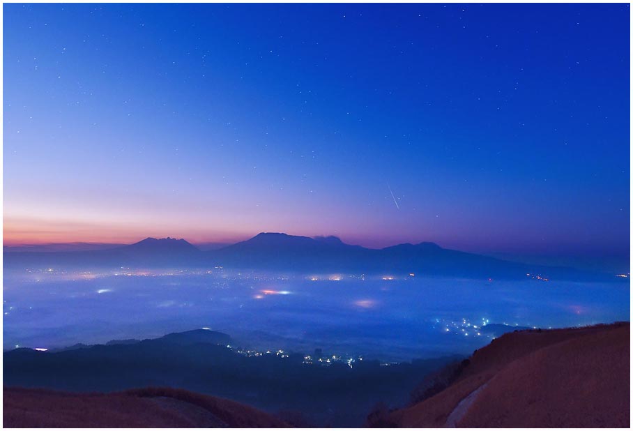 秋に何度か立ち寄った事は有るが、阿蘇谷に霧が掛かる事は無かった。この日も沢山の流星見物や、日の出を目当てにか