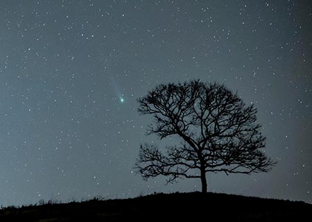 彗星の高度が高いことにまず驚いた、広角がないと地上の風景を入れて撮影する事は、不可能。双眼鏡で見ると4度程度の核から広がった扇状の