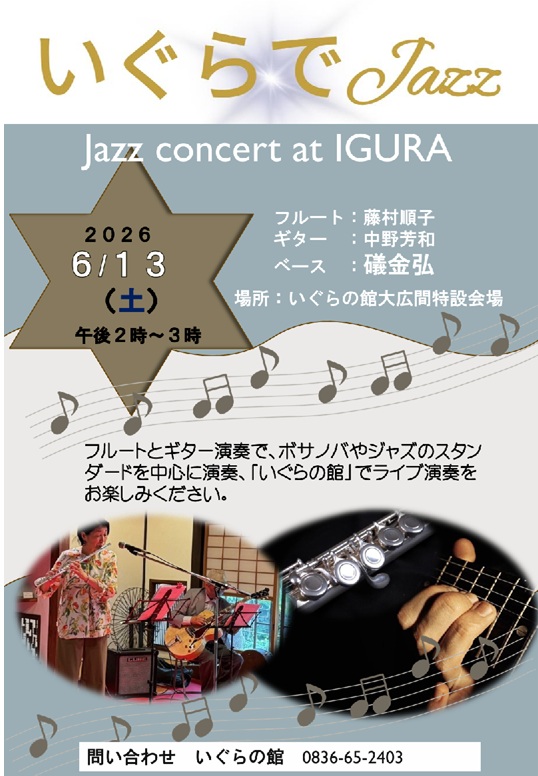 2026年6月13日(土)”いぐらでJazz”フルート,ギター、ベースのJazzトリオ演奏会 フルート、ギター、ベースのトリオ演奏でボサノバやジャズのスタンダードを中心に演奏、いぐらの館でライブ演奏をお楽しみください。