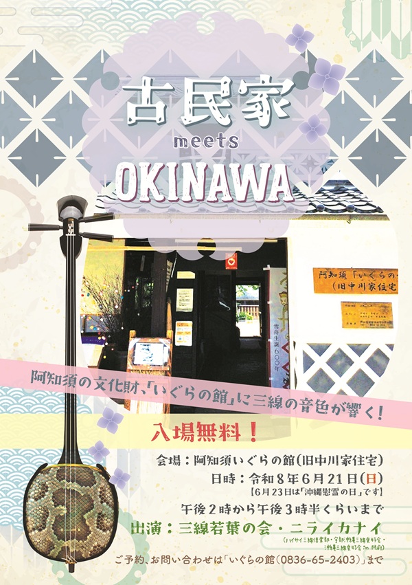 2026年6月21日(日)”古民家meets OKINAWA”(沖縄音楽演奏会) 沖縄慰霊の日」は6月23日ですが、沖縄音楽を楽しんでもらいたいとの思いで、山口市や宇部市とその近隣で沖縄音楽の演奏活動をされている「三線若葉の会」と「ニライカナイ」の皆さんの演奏会が開催されます。「芭蕉布」や「安里屋ゆんた」など親しみやすく、よく知られている曲を中心に、気軽に楽しめる演奏会です。