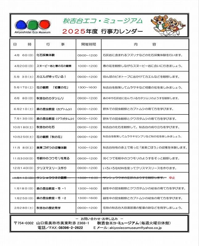 | 秋吉台エコ・ミュージアム行事案内 (参加募集中などのチラシをクリックすると印刷できます。) |