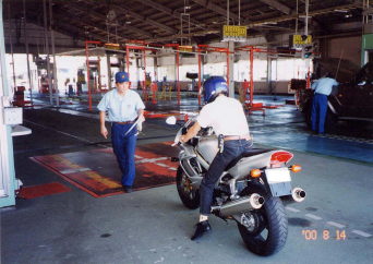 再び二輪車コースに行き、入り口で「光軸検査のみ」を選択するボタンを押し、ラインに入り、再検査で合格でした。
