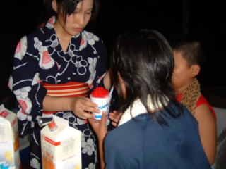 かき氷を作るゆかた姿のお姉さんは、シャキシャキとした感じのミス「久兼の里」のようで、久兼地区の将来が楽しみです。