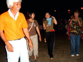 万年青年(?)も、若い女子学生に盆踊りの手ほどきができ、いつものむっつり顔がゆるみ放しです。