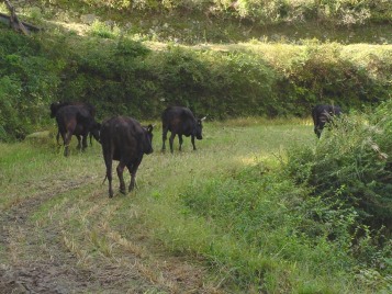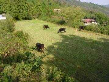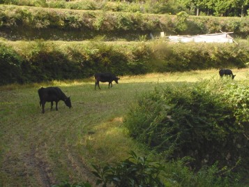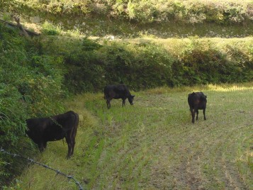 ふるさと牧場では牛舎で毎朝給餌をした後、牛舎裏の柵を開けると牛たちは順序よく棚田や里山へと出かけていきます。