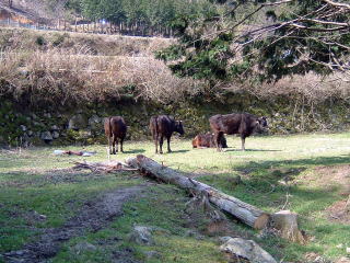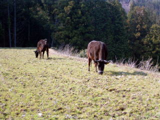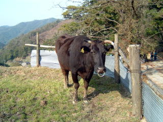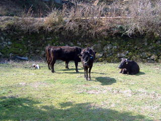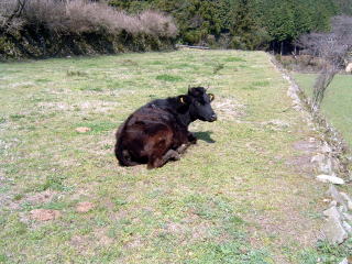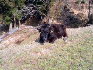 当日は、コブシの花見会で山の中腹はにぎやかなイベントか゛あるものの、牛たちは棚田で1日をのんびり過ごしていました。
