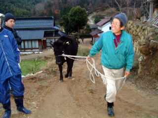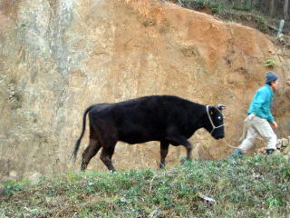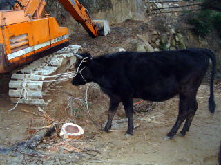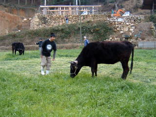 飼料畑へ降りてきた牛は、すぐに山に戻しますが、なかなか言うことを聞かない牛もいます。 そのときは、飼料畑に降りてこないよう仕付けをします。