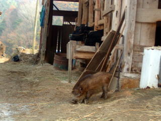 右:牛舎内で休むうり坊 下2枚:牛舎の周りをウロウロするうり坊をうかがう子ども