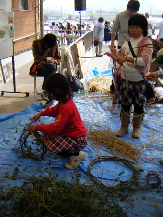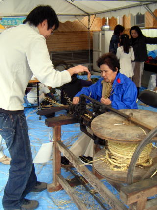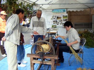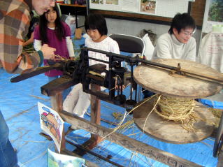 11月2日(日)、3連休の中日、地元・小野小学校で開催された「小野ふれあい祭」。 昨年からは屋外のテントブースへの出展展示となり、来場者参加型の展示として「カズラ作り」と併せて、今年は「縄ない機」の展示・実演体験を行いました。 「縄ない機」の展示・実演体験年配者や子どもさんたちに非常に好評で、「カズラ作り」の方も若いお母さんたちに好評でした。