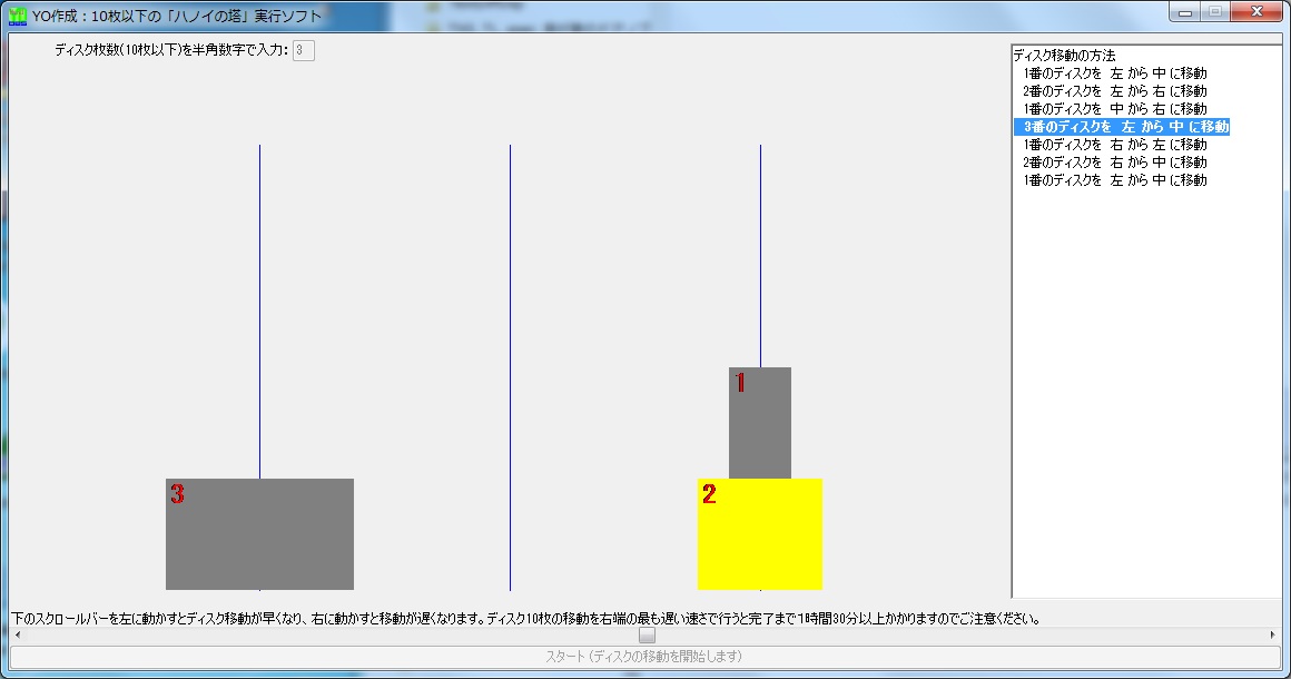 ディスクを一回に一枚ずつどれかの棒に移動させることができますが、
