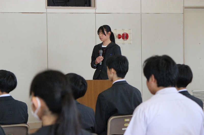 暑さも少し和らぎ、今年度も残り半分となりました。10月の全校集会では、専門委員長がこれからの取組や目標を発表しました。総務委員長から授業の最初や終わりの礼についても新たな提案があり、さらに活気が出そうです。また、表彰式が行われ、美祢市読書感想文優良賞の生徒の表彰も行われました。