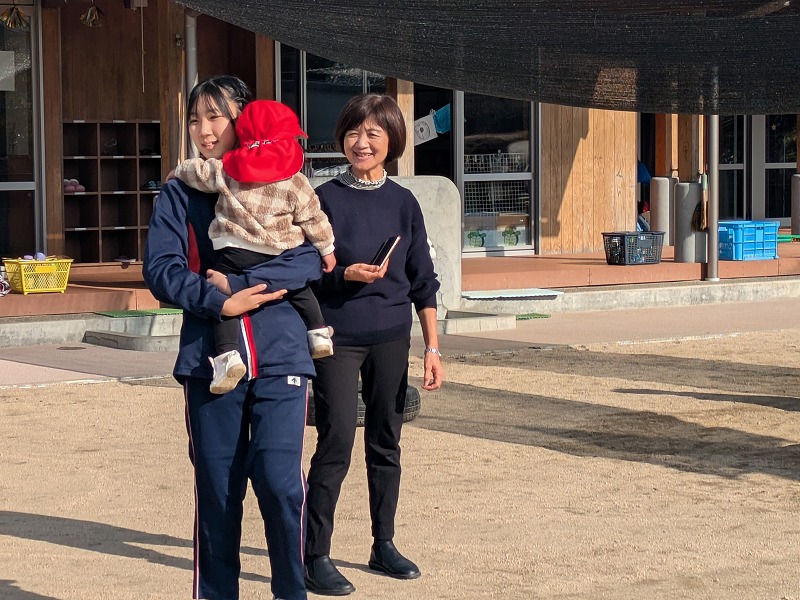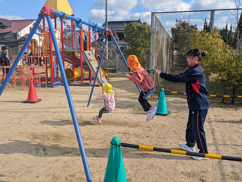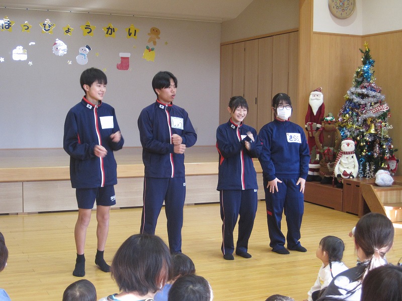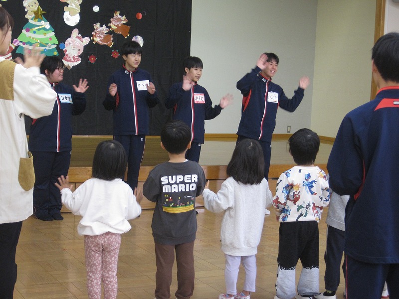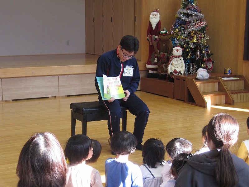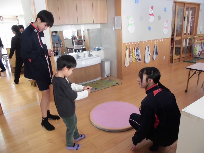 3年生の家庭科の学習では、幼児との関わり方を学んでいます。その一環で、2度に分けて3年生が保育実習を行います。今回(12月9日)は秋芳桂花保育園でした。かわいらしい園児の笑顔に引き込まれるように、3年生もにこやかに園児とふれあっていました。絵本を読んであげたり、子ども達のおもちゃで一緒に遊んだり、外遊びをしたり、あっという間の時間でした。秋吉保育での実習は12月12日(金)を予定しています。